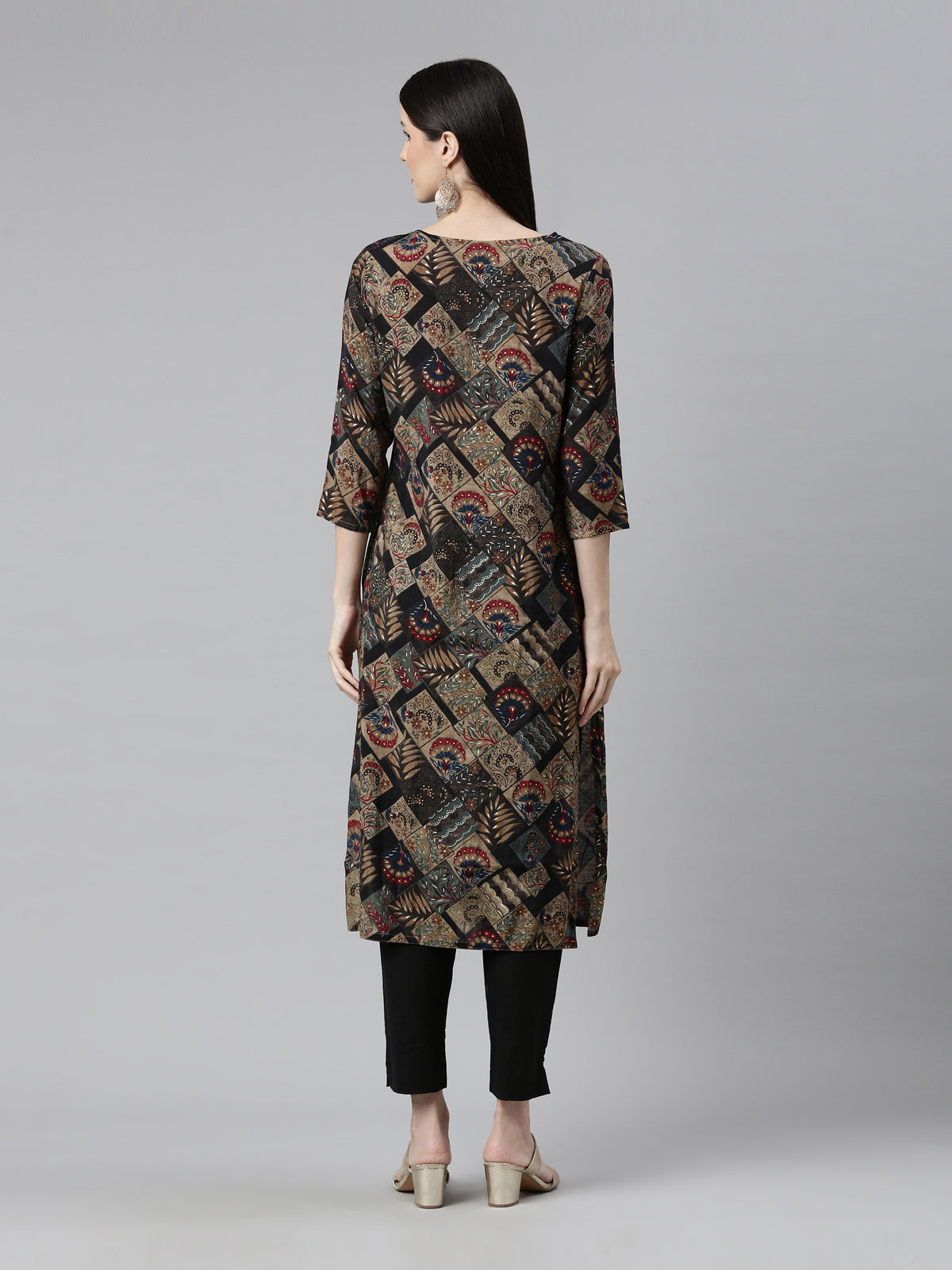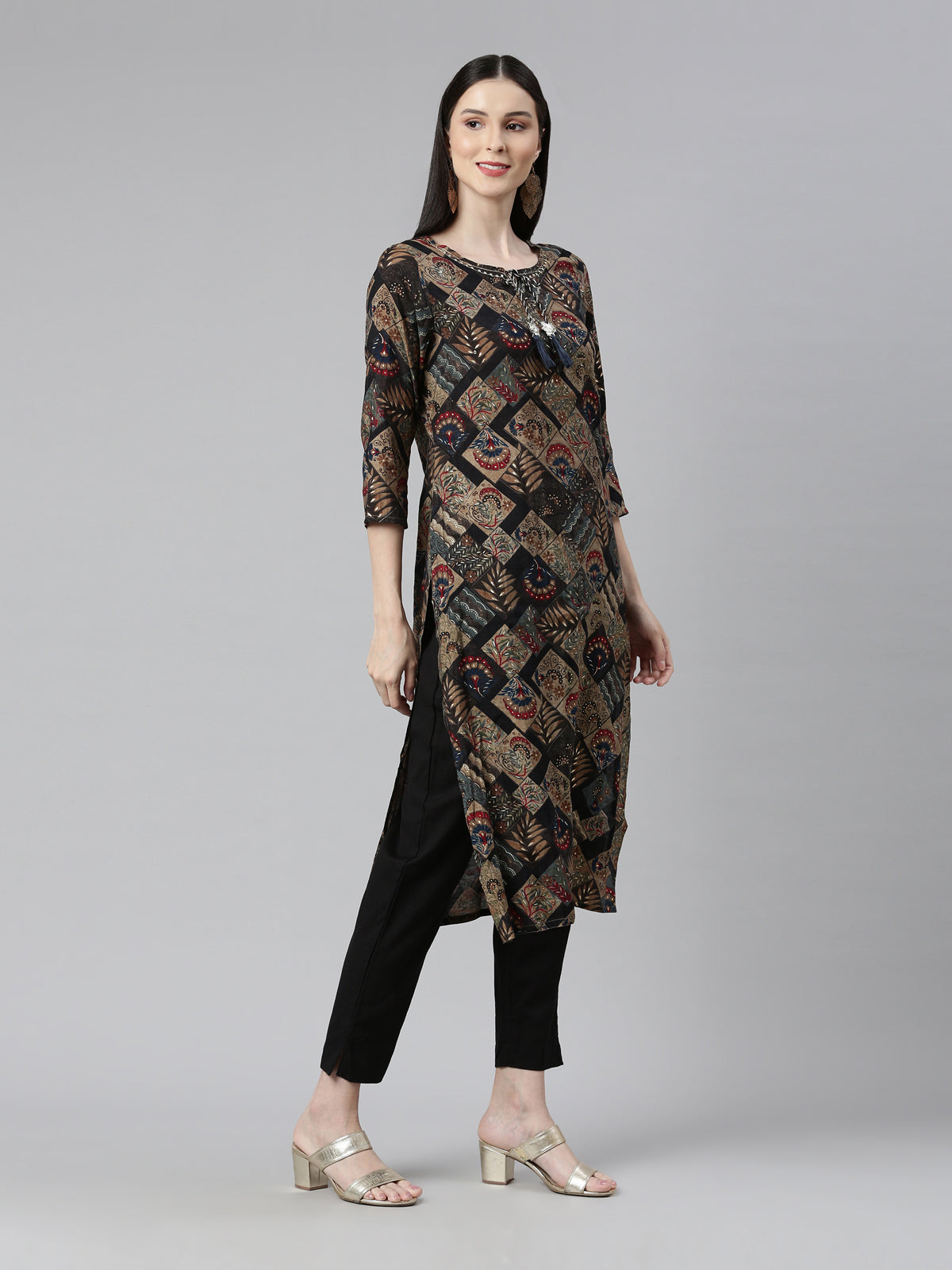 Neerus Women Black Ethnic Motifs Printed Keyhole Neck Pure Cotton Kurta Comfortable and stylish, this kurta is made of pure cotton, making it perfect for everyday wear. Experience traditional elegance with a modern twist.