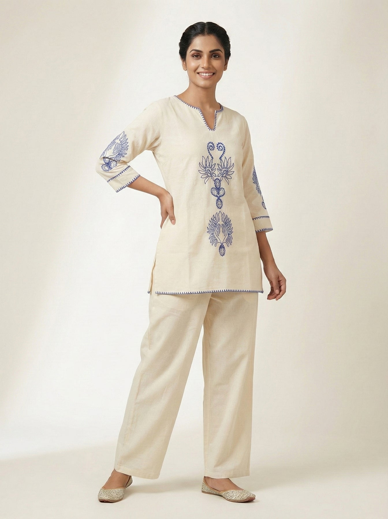 Elevate your everyday wardrobe with this stunning cream cotton coord set, where timeless elegance meets contemporary style. Featuring intricate floral embroidery that adds a touch of sophistication, this versatile two-piece ensemble transitions seamlessly from casual outings to festive occasions. Crafted from breathable cotton, it ensures comfort throughout the day while the coordinated design makes styling effortless. Perfect for those who appreciate traditional craftsmanship with a modern twist, this set celebrates the beauty of handcrafted details. Whether worn together or mixed with your existing pieces, it's an investment in versatile, graceful fashion that never goes out of style.