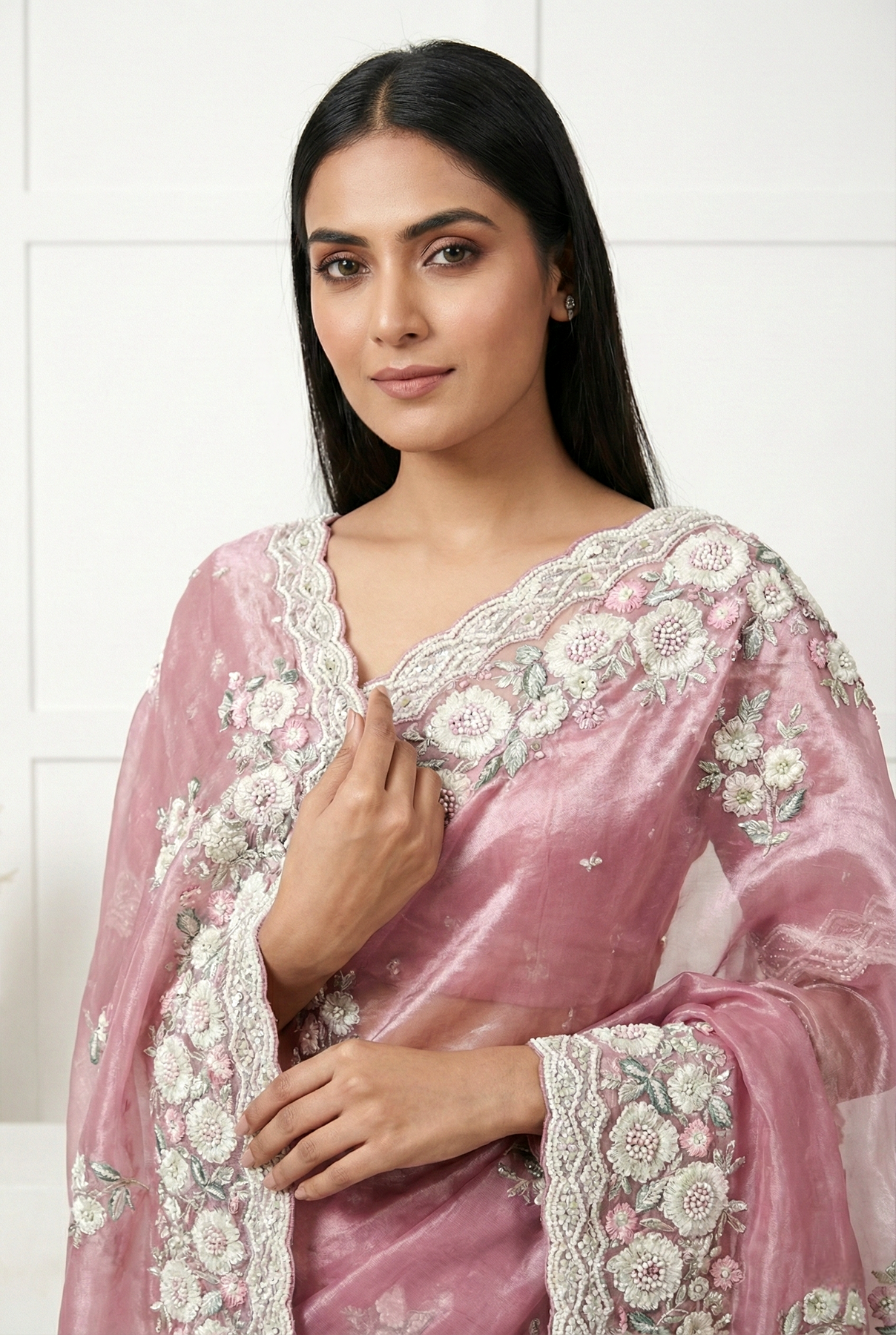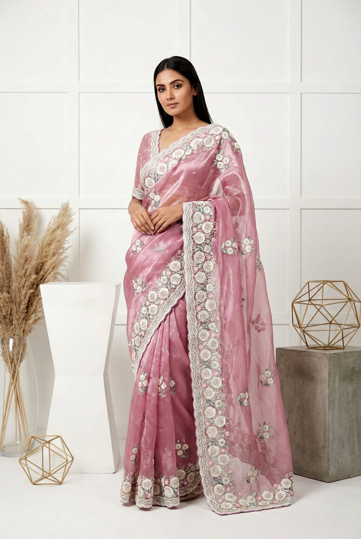 Elevate your ethnic wardrobe with this exquisite lavender organza saree, a masterpiece of traditional craftsmanship. The sheer, lightweight organza fabric drapes gracefully while maintaining its structure, creating an ethereal silhouette. Intricate floral embroidery adorns the entire length, showcasing meticulous detailing that reflects timeless artistry. The heavy embellishment work adds dimension and richness, making it ideal for weddings, festivals, and formal celebrations. This versatile piece seamlessly transitions from daytime gatherings to evening events, offering both elegance and comfort. Perfect for those who appreciate refined aesthetics and quality craftsmanship in contemporary ethnic fashion.