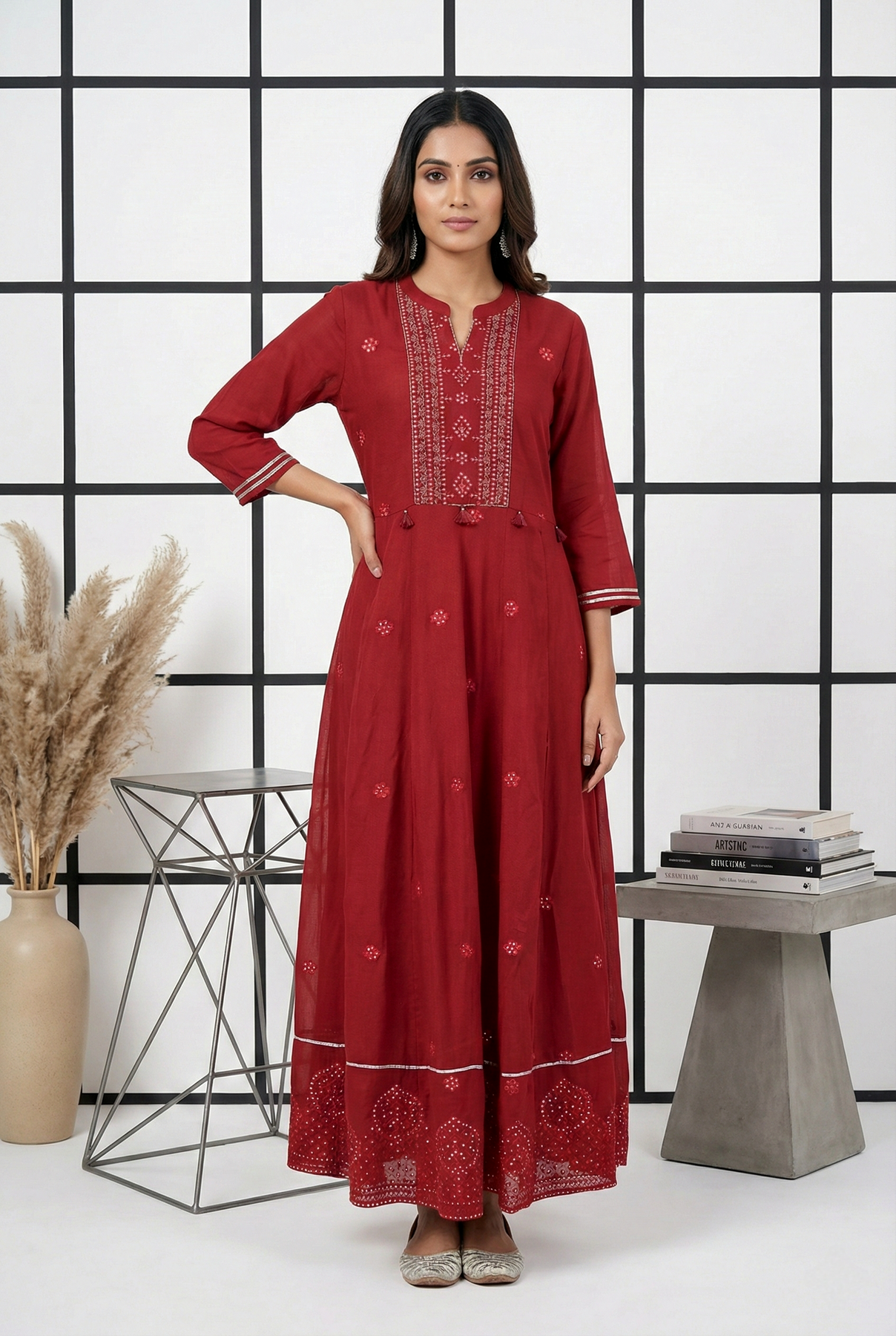 Elevate your ethnic wardrobe with this stunning maroon georgette long dress, a masterpiece of traditional craftsmanship. Adorned with intricate hand embroidery that showcases meticulous artistry, this piece seamlessly blends timeless elegance with contemporary silhouettes. The luxurious georgette fabric drapes gracefully, offering comfort and a refined aesthetic perfect for festive occasions, celebrations, or upscale gatherings. Each embroidered detail tells a story of skilled handiwork, making this dress a distinctive addition to your collection. Ideal for those who appreciate the finer nuances of traditional Indian fashion with a modern sensibility.