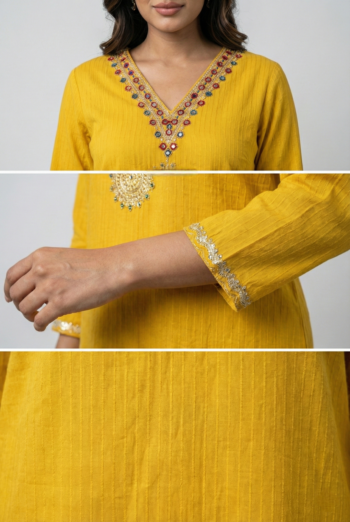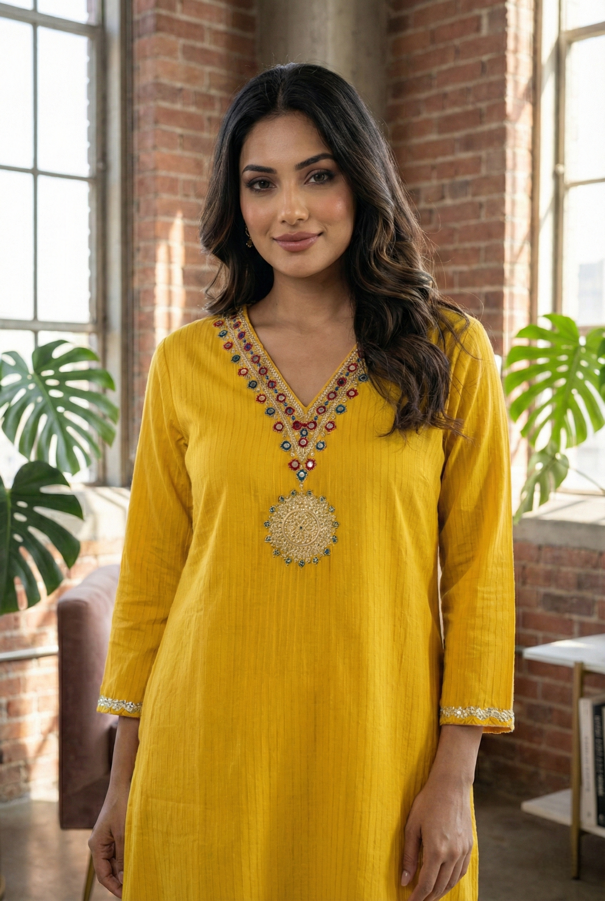 Elevate your ethnic wardrobe with this sophisticated mustard rayon kurta, meticulously crafted with intricate hand embroidery. The rich, warm mustard hue complements all skin tones, while the fluid rayon fabric drapes beautifully for effortless comfort. Each embroidered detail is a testament to traditional artisanal craftsmanship, making this piece a timeless addition to your collection. Perfect for festive occasions, cultural celebrations, or refined everyday wear, this kurta seamlessly blends heritage elegance with contemporary style.