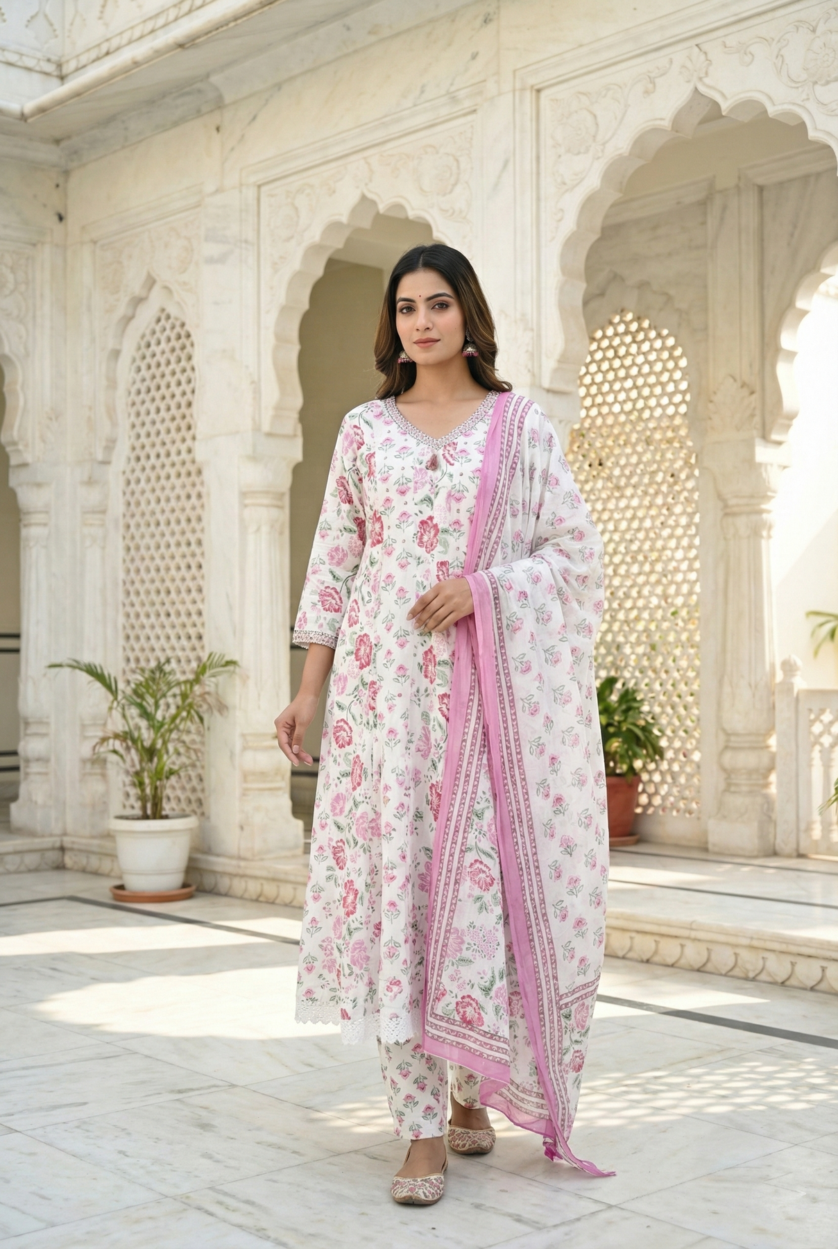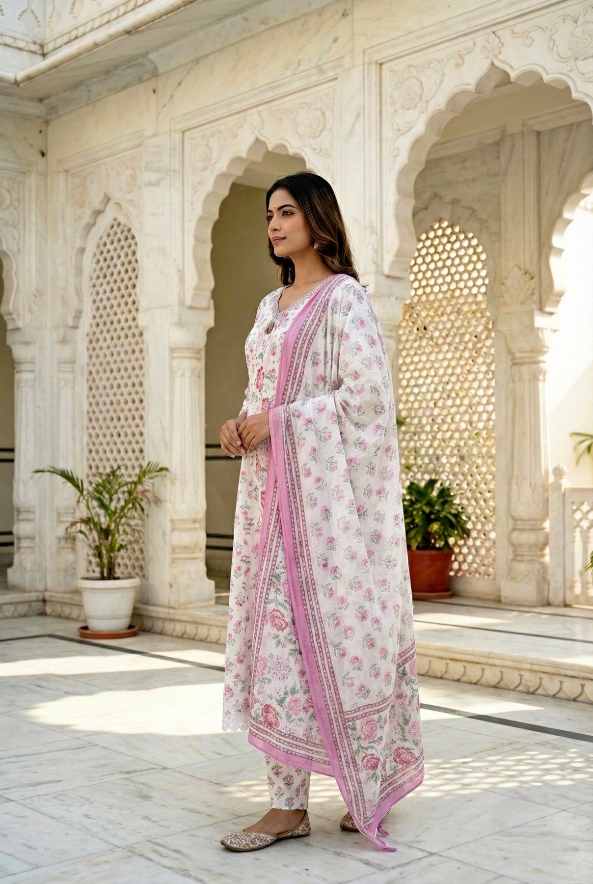 Elevate your everyday elegance with this stunning pink cotton three-piece set, where traditional craftsmanship meets contemporary style. Each piece features intricate hand embroidery with delicate floral motifs, showcasing the artistry of skilled artisans. The soft, breathable cotton fabric ensures comfort throughout the day, making it perfect for both casual gatherings and special occasions. This versatile ensemble allows you to mix and match, creating multiple looks from a single investment. Celebrate authentic Indian craftsmanship while enjoying timeless beauty and uncompromising comfort.
