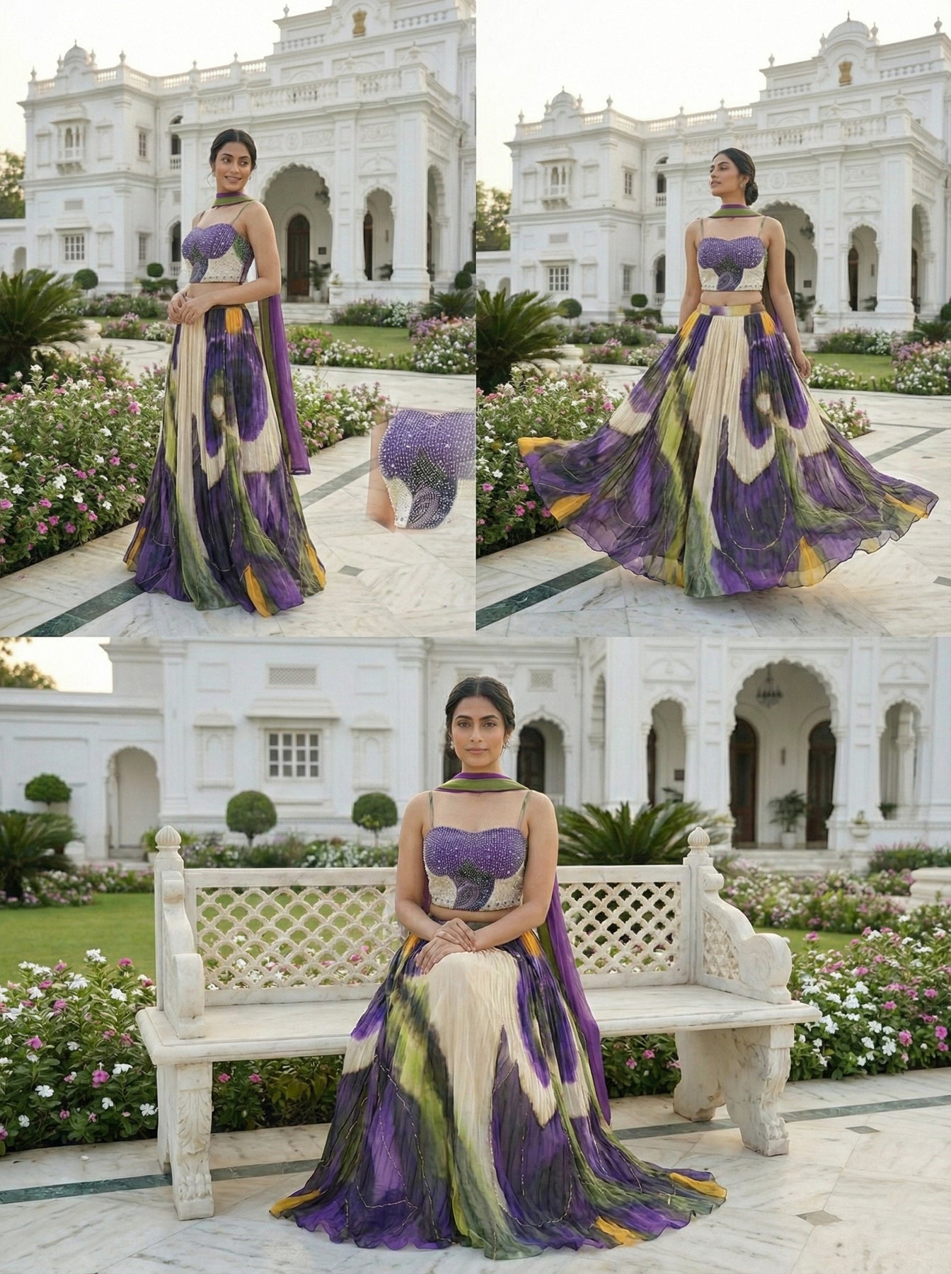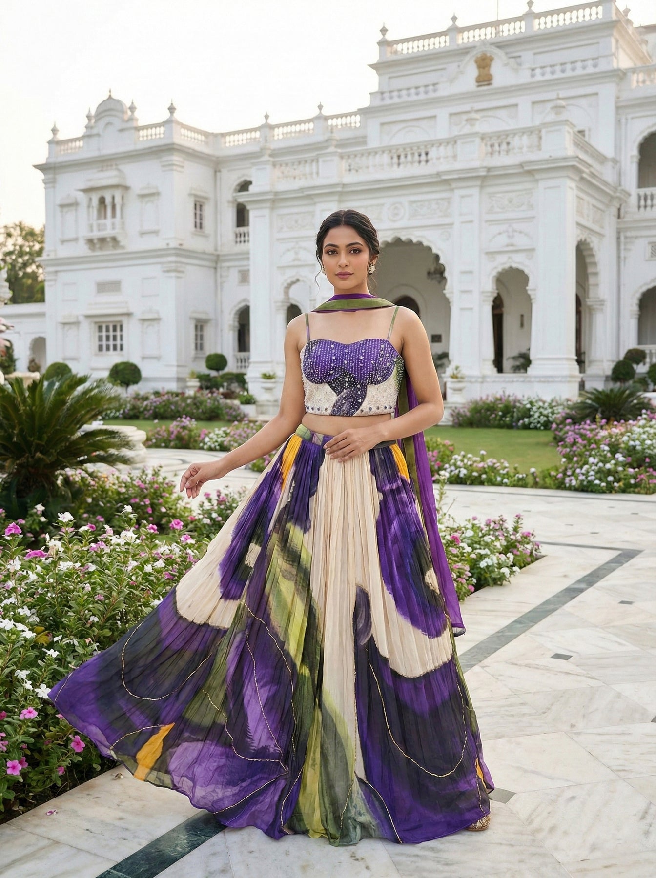 Elevate your festive wardrobe with this stunning purple Chinon ghagra set, a perfect blend of traditional elegance and contemporary charm. Crafted from premium Chinon fabric, this ensemble features intricate beadwork and stone embellishments that catch the light beautifully, adding a touch of glamour to every twirl. The richly colored purple creates a regal appearance, making it ideal for weddings, celebrations, and special occasions. The flowing ghagra silhouette offers comfort without compromising on style, while the detailed embroidery showcases expert craftsmanship.