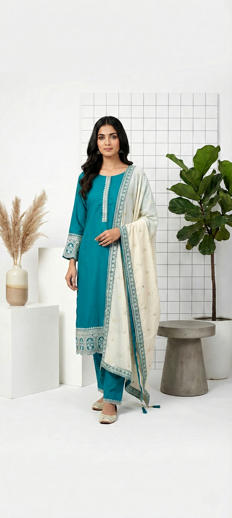 Elevate your ethnic wardrobe with this exquisite three-piece ensemble crafted from luxurious Rama silk. Each piece showcases intricate hand embroidery, a testament to traditional artisanal craftsmanship. The set combines timeless elegance with refined detailing, perfect for festive occasions, celebrations, or when you desire understated sophistication. The natural drape of silk ensures comfort while maintaining an air of grace and poise. An investment in quality that transcends seasons and trends.