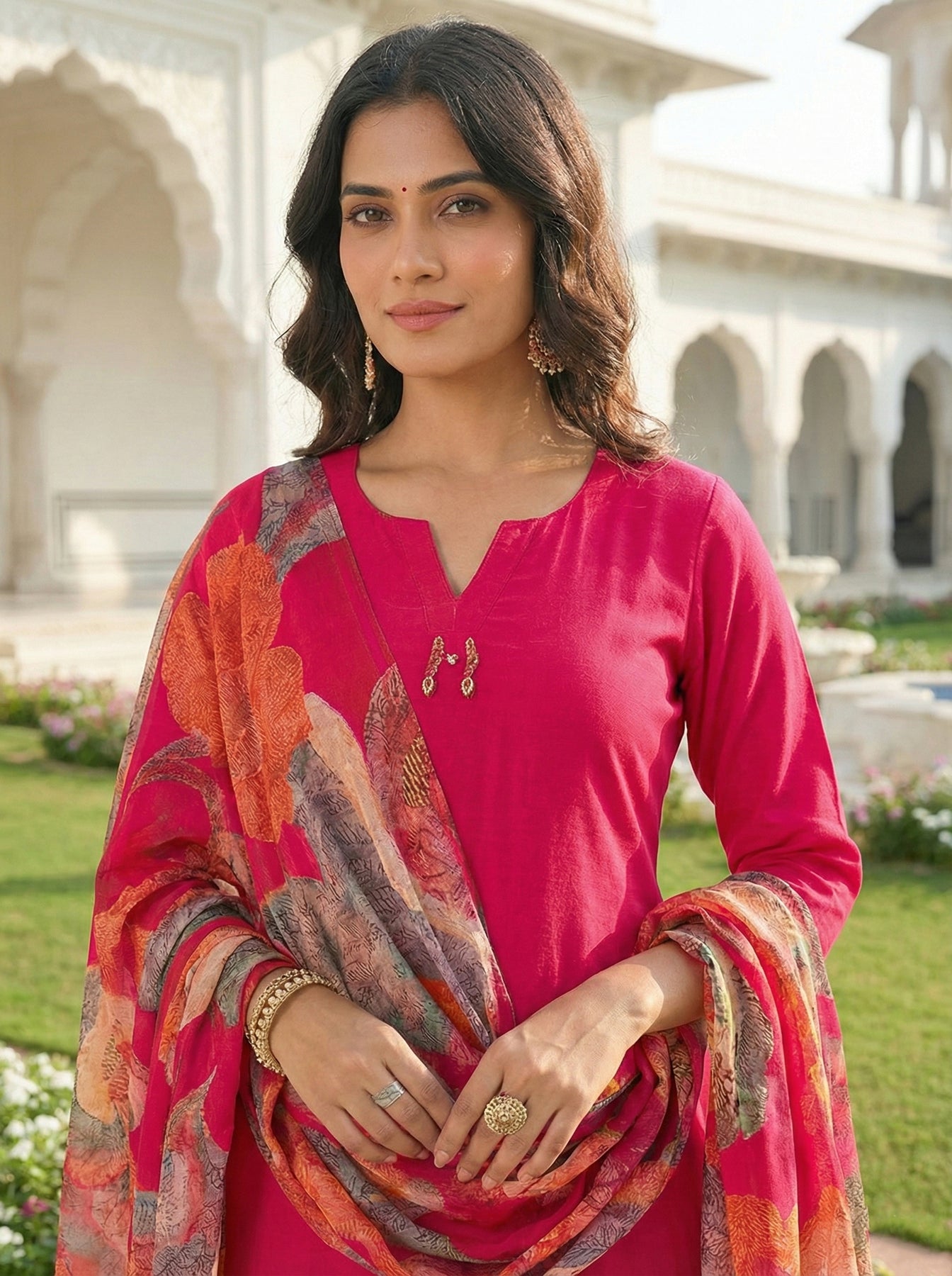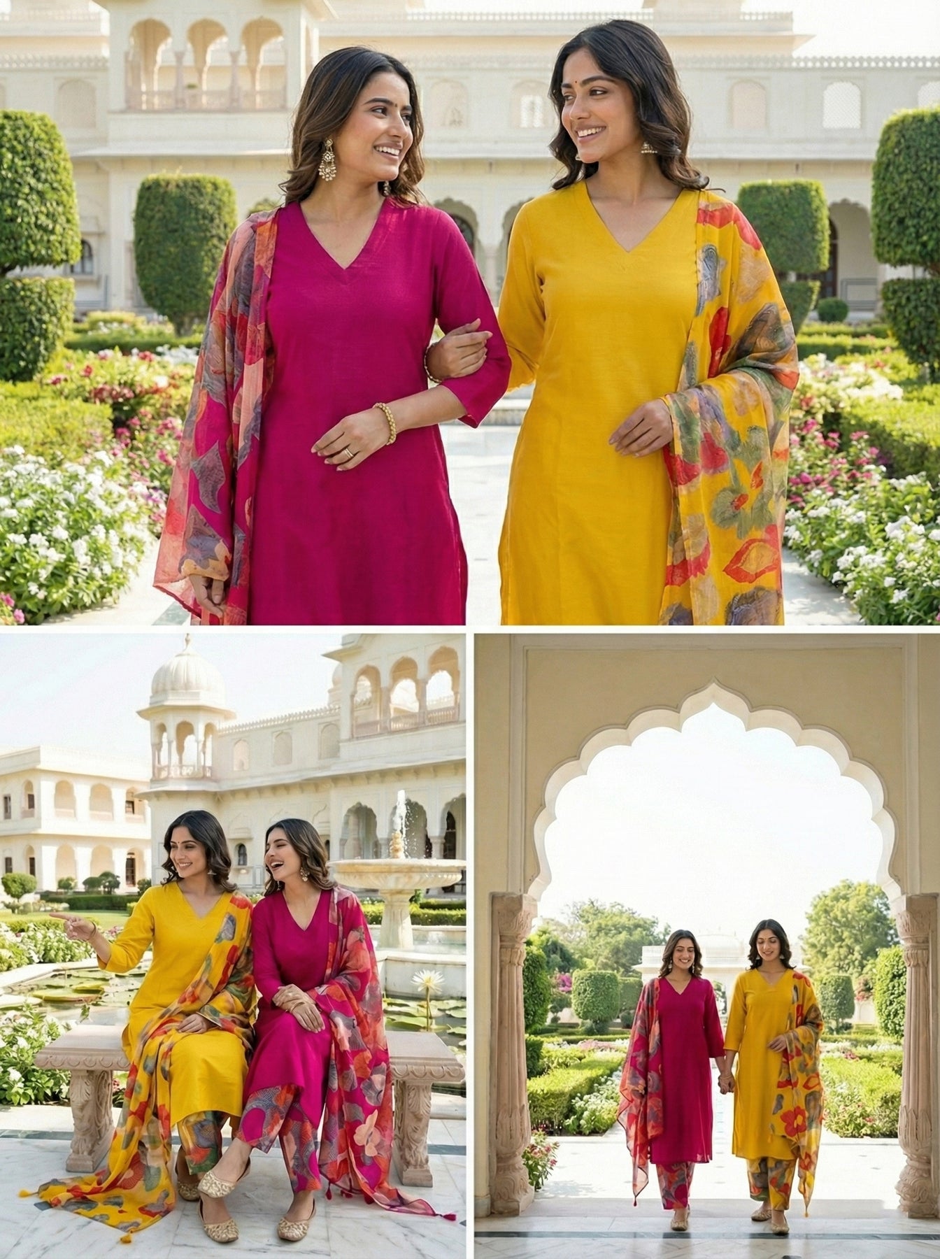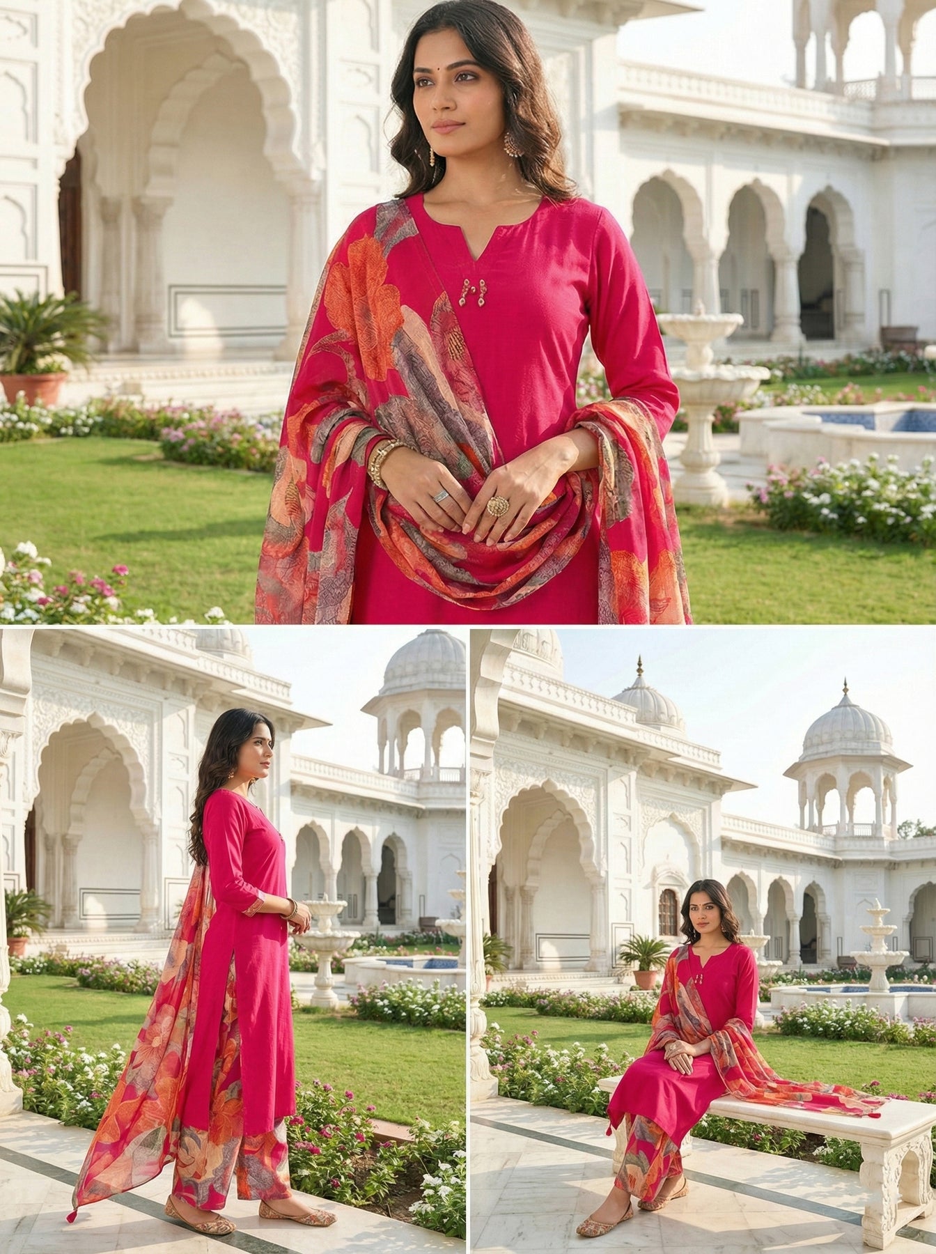 Elevate your wardrobe with this exquisite Rani Muslin Three Piece Set, crafted from premium muslin fabric renowned for its exceptional softness and breathability. This versatile ensemble features three coordinated pieces designed to offer multiple styling options for both casual and formal occasions. The delicate drape and lightweight construction make it ideal for warm climates, while the rich rani hue adds timeless elegance to your collection. Perfect for those who appreciate quality craftsmanship and traditional aesthetics with contemporary appeal.