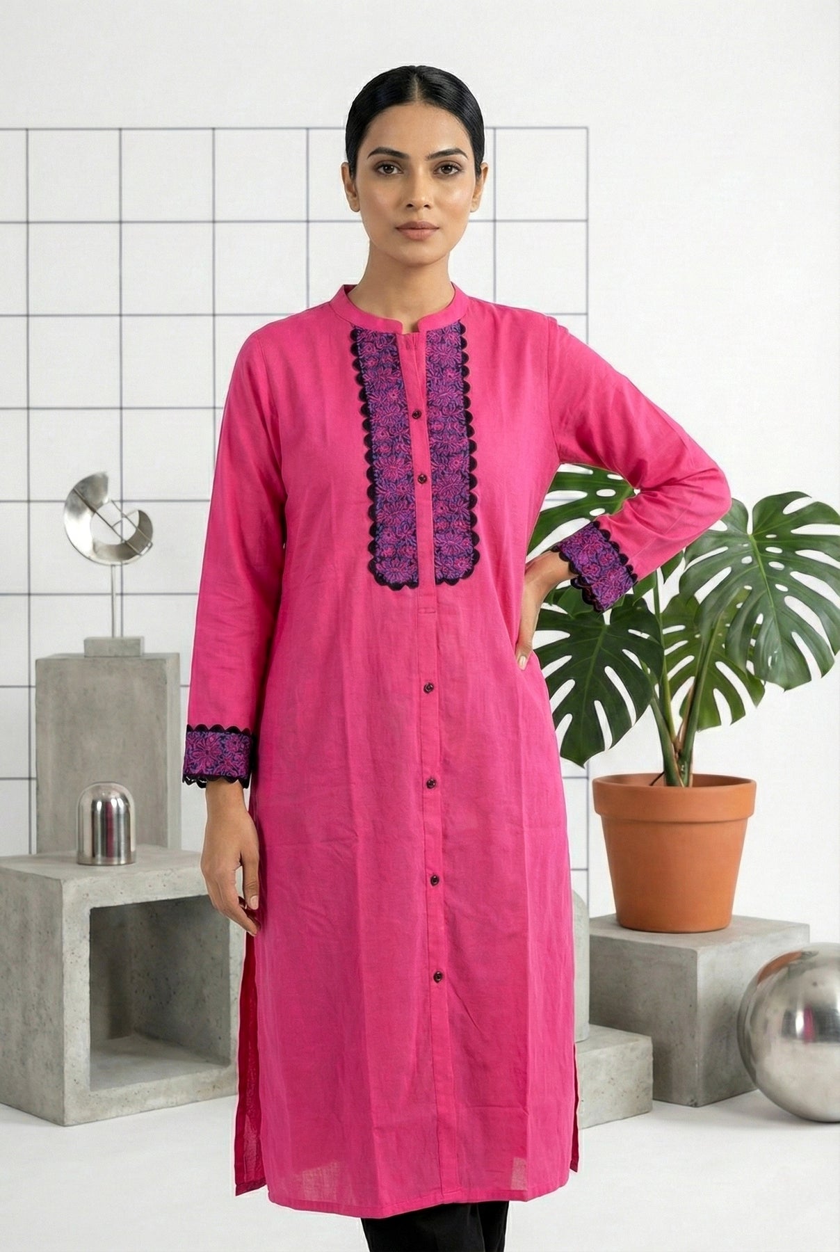 Embrace timeless elegance with this stunning Rani Pink Rayon Hand Embroidery Kurta. Crafted from soft, breathable rayon fabric, this piece features intricate hand embroidery that showcases traditional artistry and attention to detail. The rich rani pink hue complements all skin tones beautifully, making it perfect for festive occasions, celebrations, or everyday wear. The comfortable fit and flowing silhouette ensure you feel confident and graceful throughout the day. A versatile wardrobe essential that effortlessly blends cultural heritage with contemporary style.