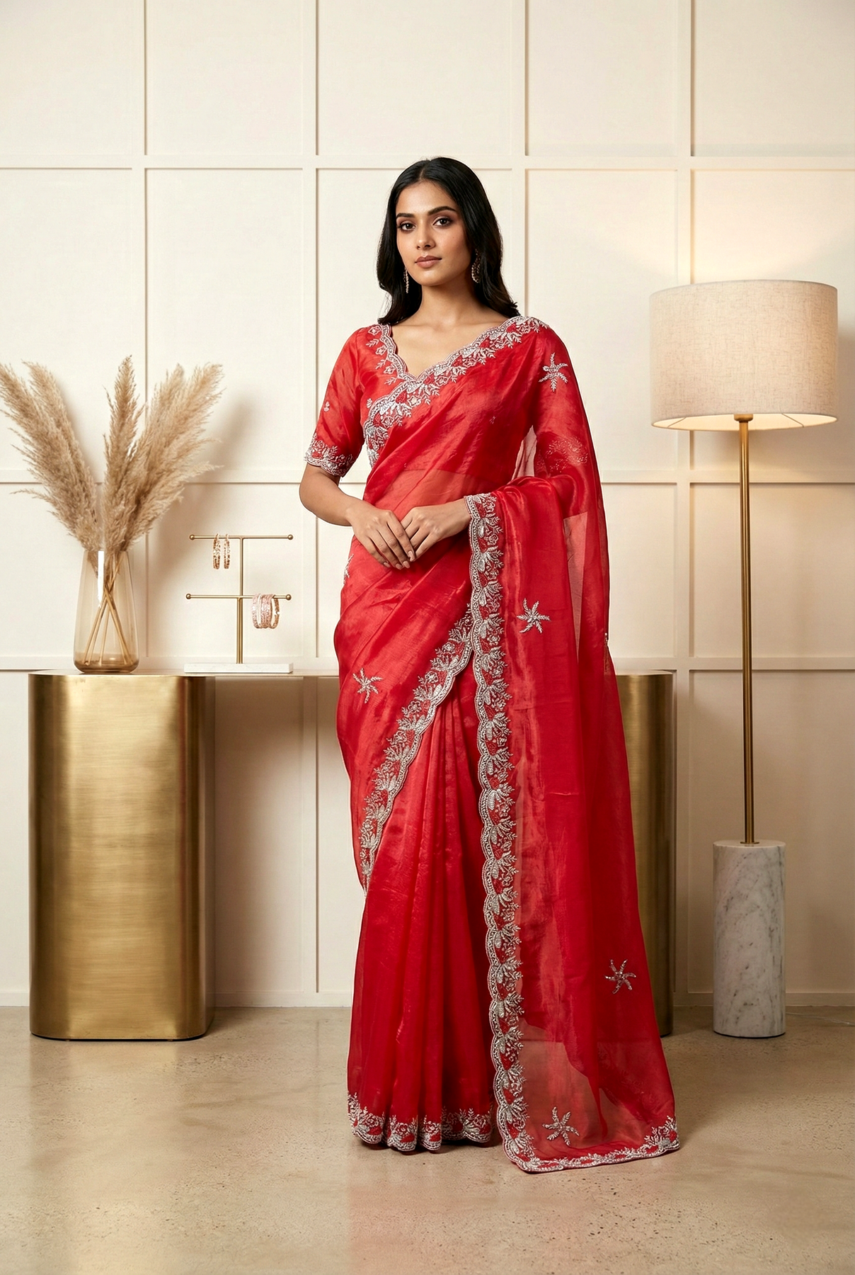 Elevate your ethnic wardrobe with this stunning red saree, adorned with intricate Jimmy Choo zari work and delicate floral embroidery. The rich crimson hue provides a timeless canvas for the elaborate gold threadwork and botanical motifs that cascade across the fabric, creating an enchanting interplay of tradition and refined elegance. Perfect for weddings, celebrations, and special occasions, this saree seamlessly blends classic Indian craftsmanship with contemporary design sensibilities. The meticulous embroidery work showcases exceptional artistry, making it a cherished addition to any discerning wardrobe. Drape it with confidence and grace for an unforgettable impression.