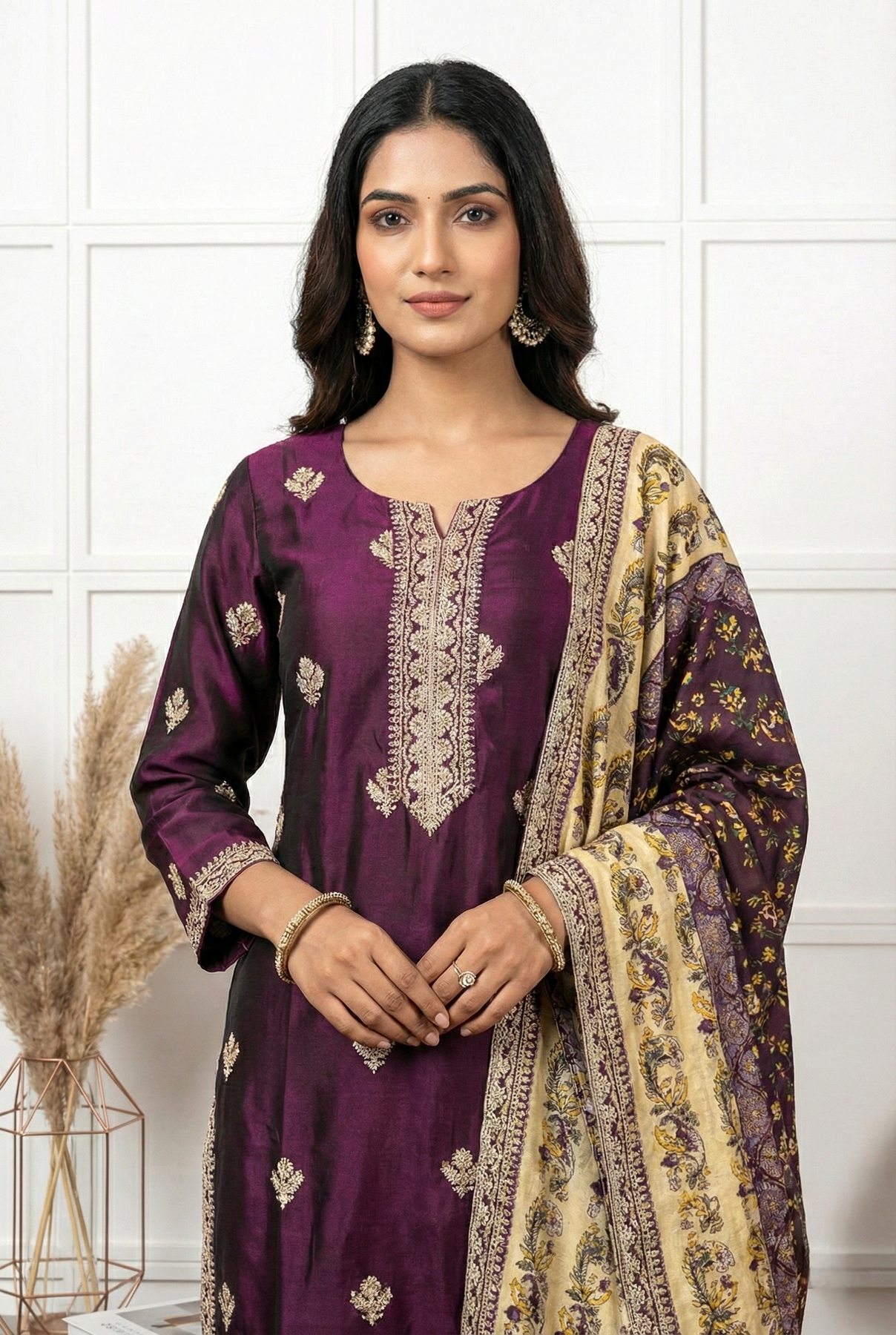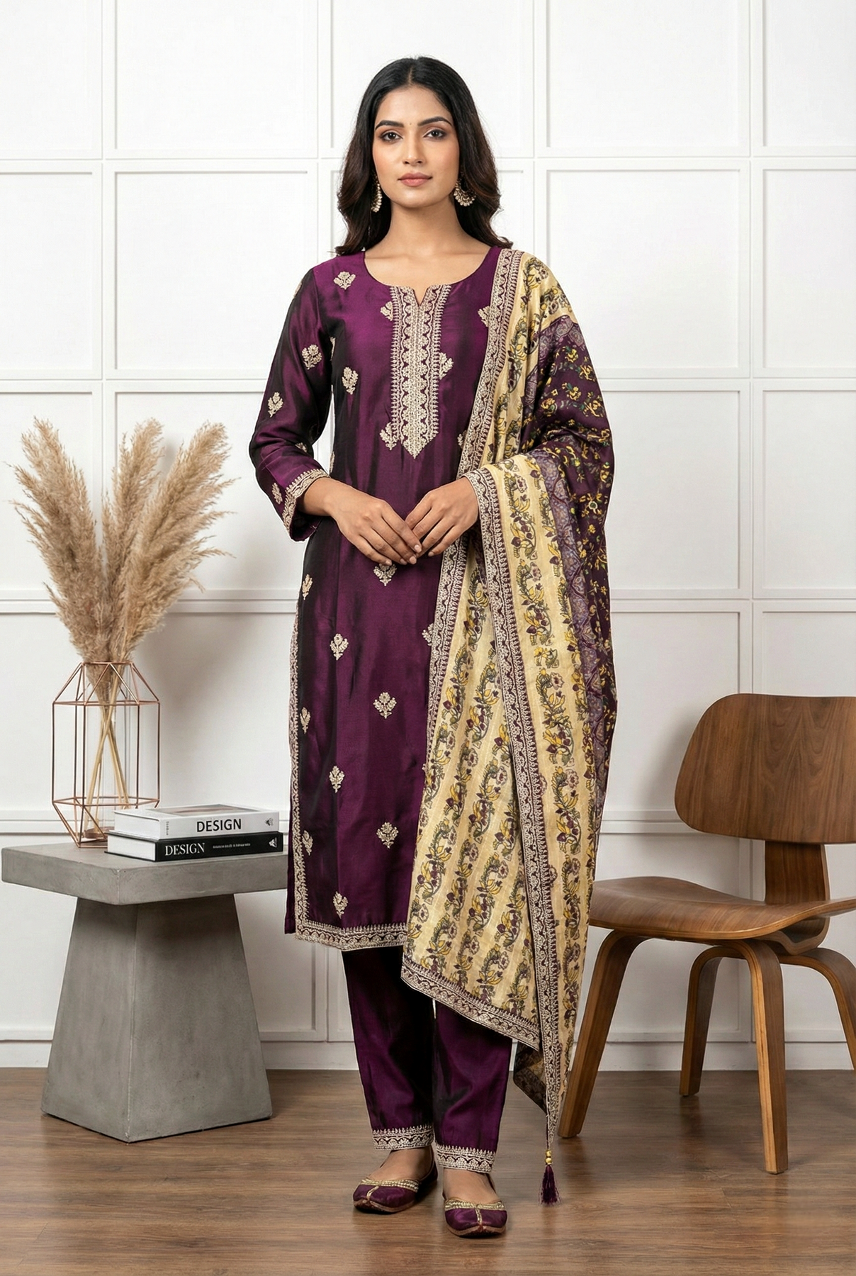 Elevate your ethnic wardrobe with this sophisticated Wine Silk Printed Three Piece Set. Crafted from premium silk fabric, this ensemble features an exquisite printed design that seamlessly blends traditional aesthetics with contemporary elegance. The three-piece composition offers versatility for various occasions, from festive celebrations to formal gatherings. The rich wine tone complements diverse skin tones while the fluid drape of silk ensures comfort throughout the day. Perfect for those who appreciate refined craftsmanship and timeless style, this set delivers both luxury and wearability in one cohesive collection.