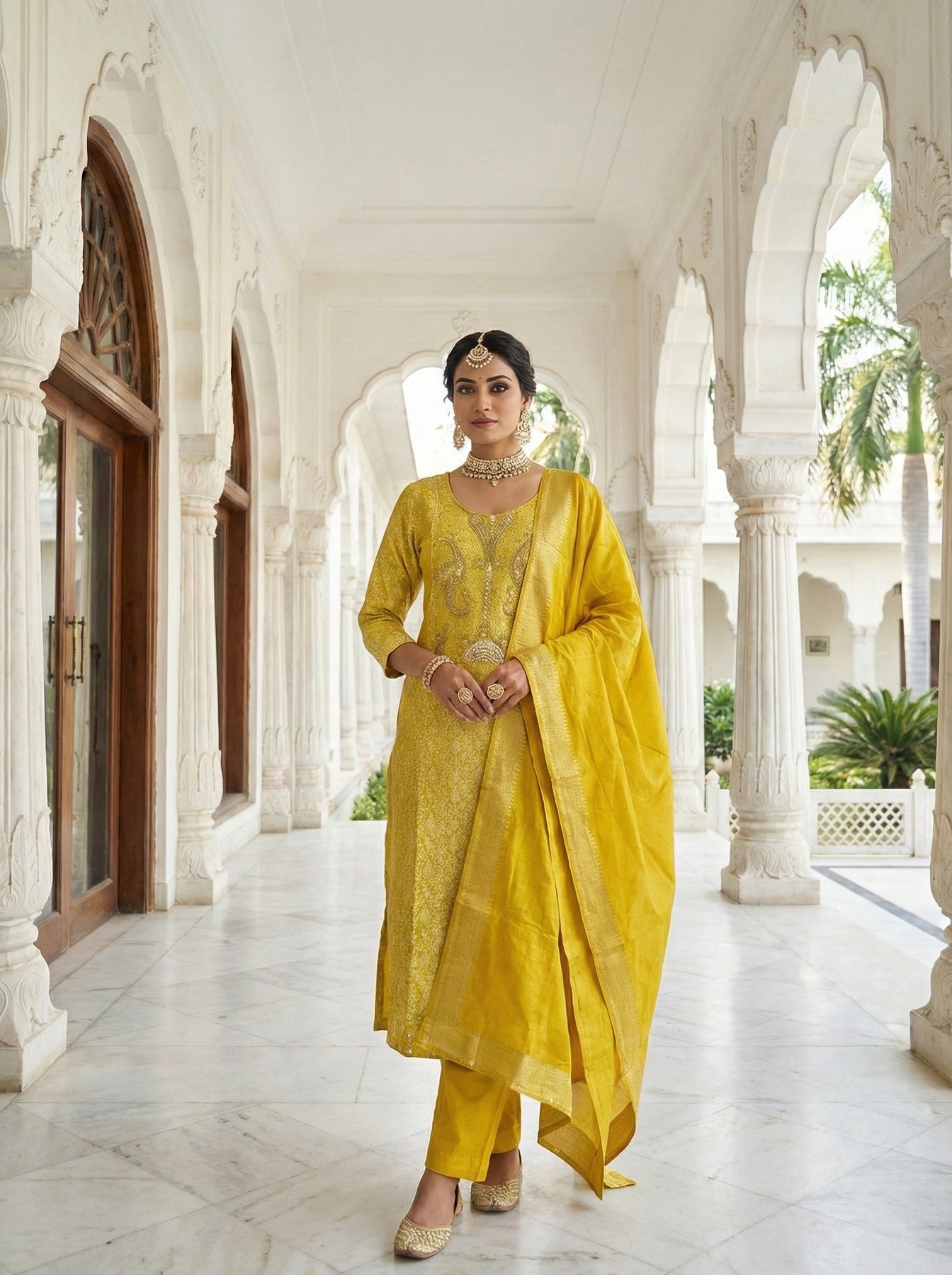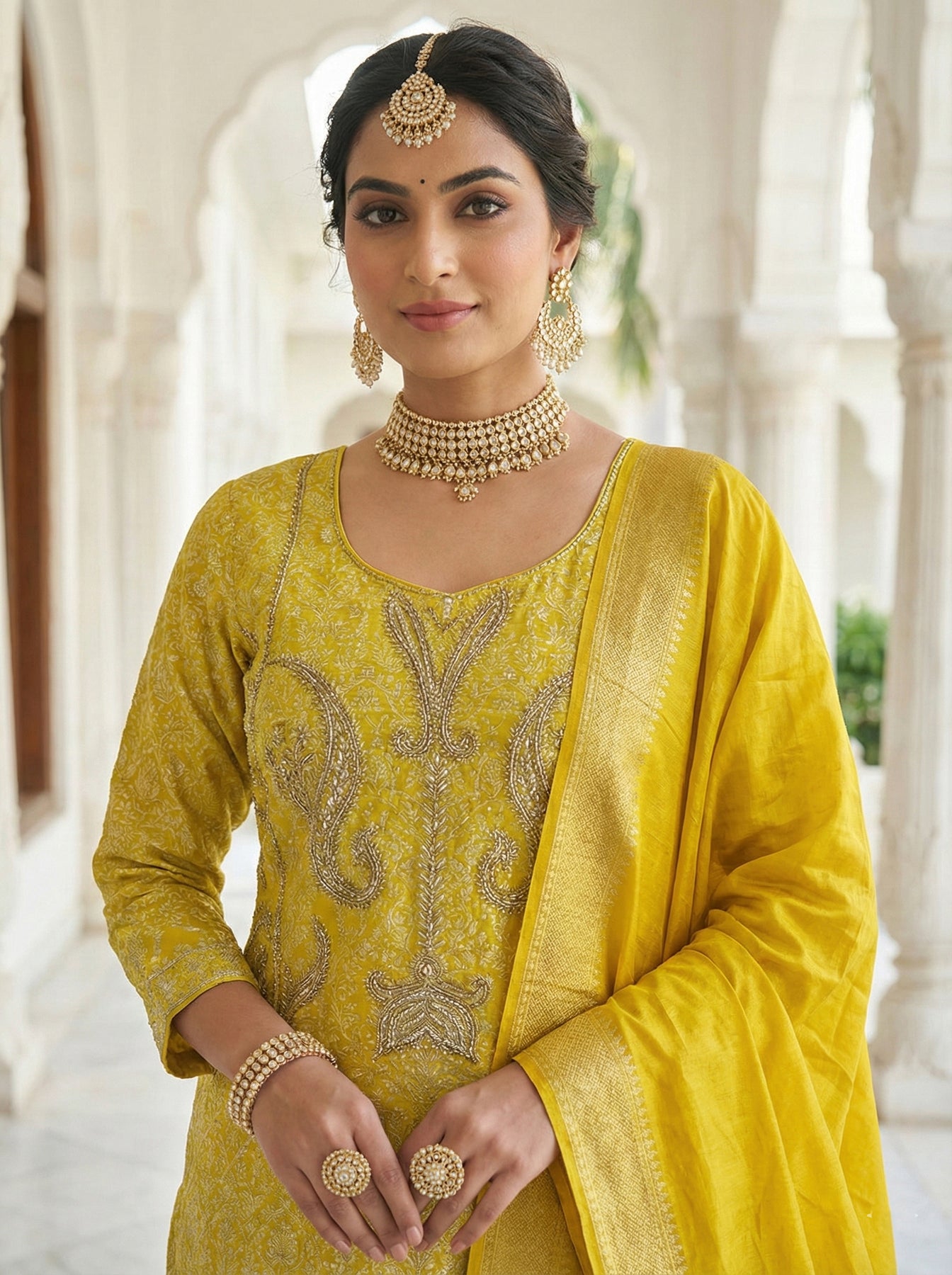 Elevate your ethnic wardrobe with this stunning Yellow Chinnon Zari Embroidery Three Piece Set. Crafted from premium chinnon fabric, this ensemble features intricate zari embroidery work that catches light beautifully, making you stand out at any occasion. The three-piece set offers versatility and complete styling—perfect for weddings, festivals, and celebrations. The rich yellow hue radiates warmth and elegance, while the delicate embroidery adds a touch of traditional craftsmanship. Comfortable yet sophisticated, this set combines timeless design with contemporary appeal, ensuring you look graceful and confident.