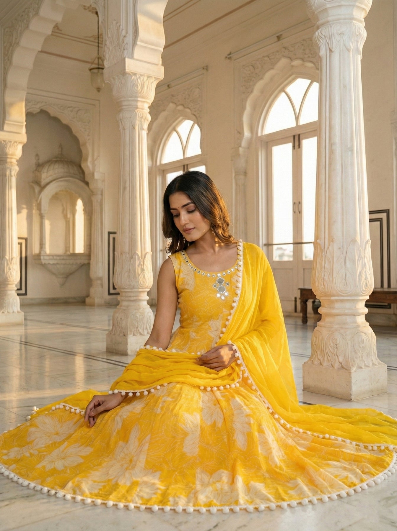 Elevate your ethnic wardrobe with this sophisticated three-piece ensemble crafted from premium yellow georgette. The delicate floral print adds timeless elegance, while the lightweight fabric ensures comfort throughout the day. Perfect for festive occasions, celebrations, or refined everyday wear, this versatile set combines traditional aesthetics with contemporary styling. The georgette's fluid drape creates a graceful silhouette, making it an ideal choice for those who appreciate quality craftsmanship and understated luxury in their traditional attire.