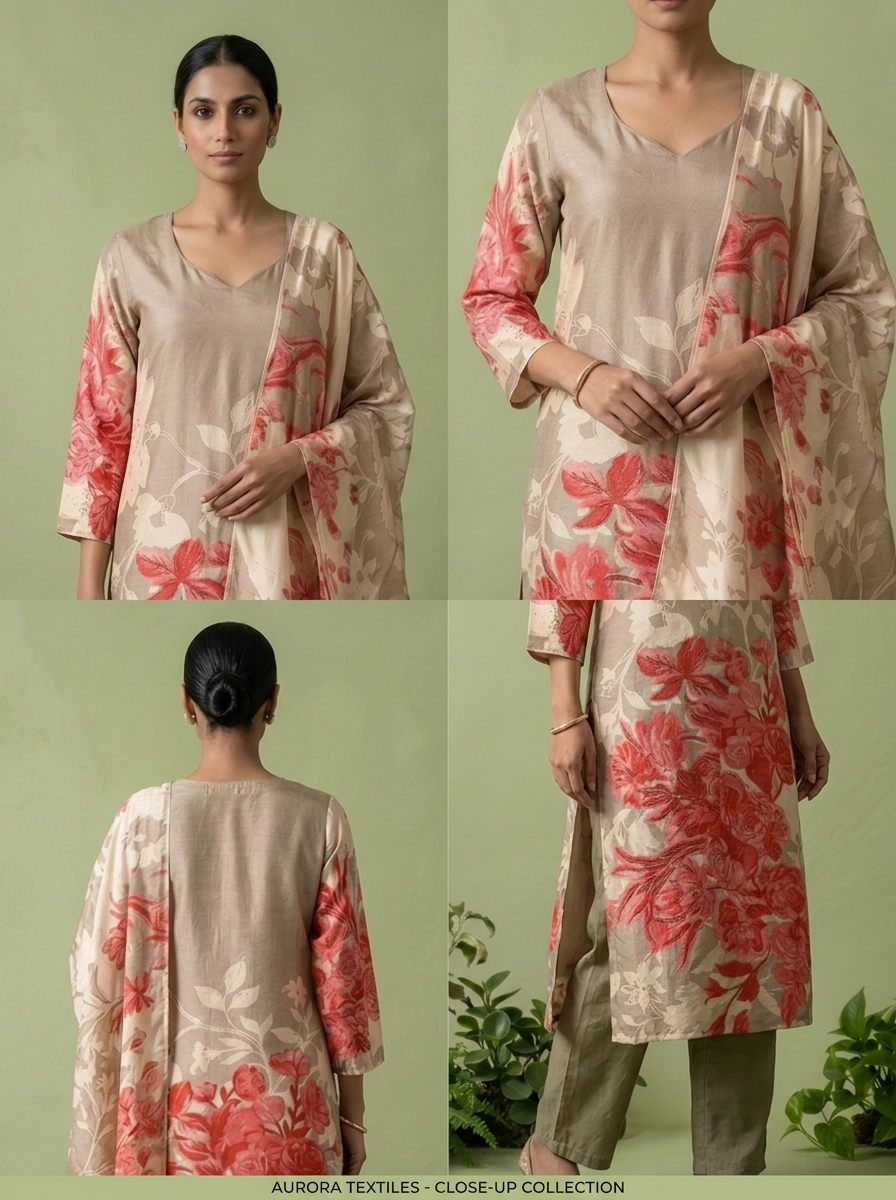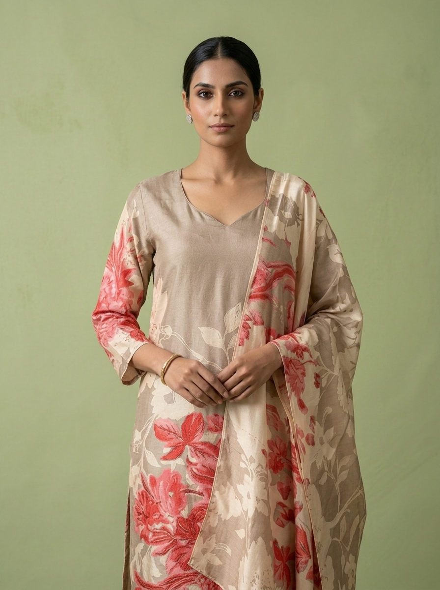 Elevate your ethnic wardrobe with this stunning three-piece silk ensemble. Featuring intricate floral digital prints in warm beige and vibrant red tones, this set combines traditional elegance with contemporary design. Crafted from premium silk fabric, it drapes beautifully and offers a luxurious feel against the skin. Perfect for festive occasions, celebrations, or making a sophisticated statement at any gathering. The coordinated pieces work seamlessly together, giving you a polished, put-together look with minimal effort. Ideal for those who appreciate fine craftsmanship and timeless style.