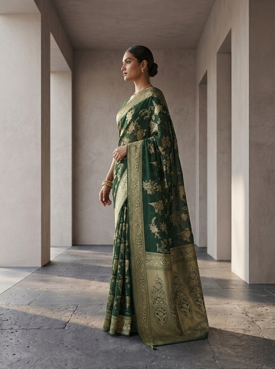 Embrace timeless elegance with this exquisite Bottle Green Banaras saree, a masterpiece of traditional Indian weaving. Adorned with intricate floral designs meticulously woven into the fabric, this saree showcases the rich heritage of Banaras craftsmanship. The deep bottle green hue exudes sophistication and pairs beautifully with both traditional and contemporary styling. The delicate floral patterns add dimension and visual interest, making it perfect for weddings, festivals, and special occasions.