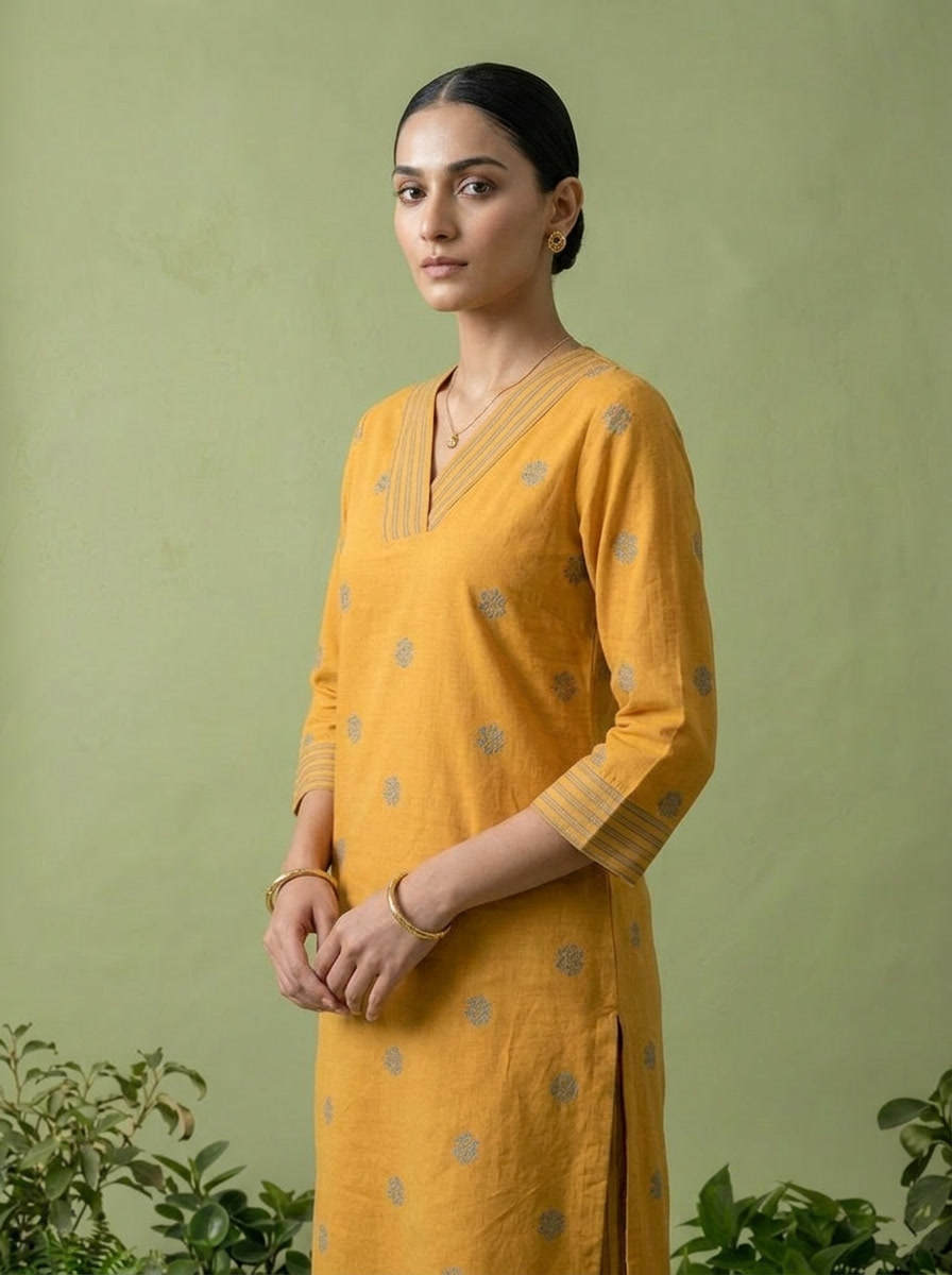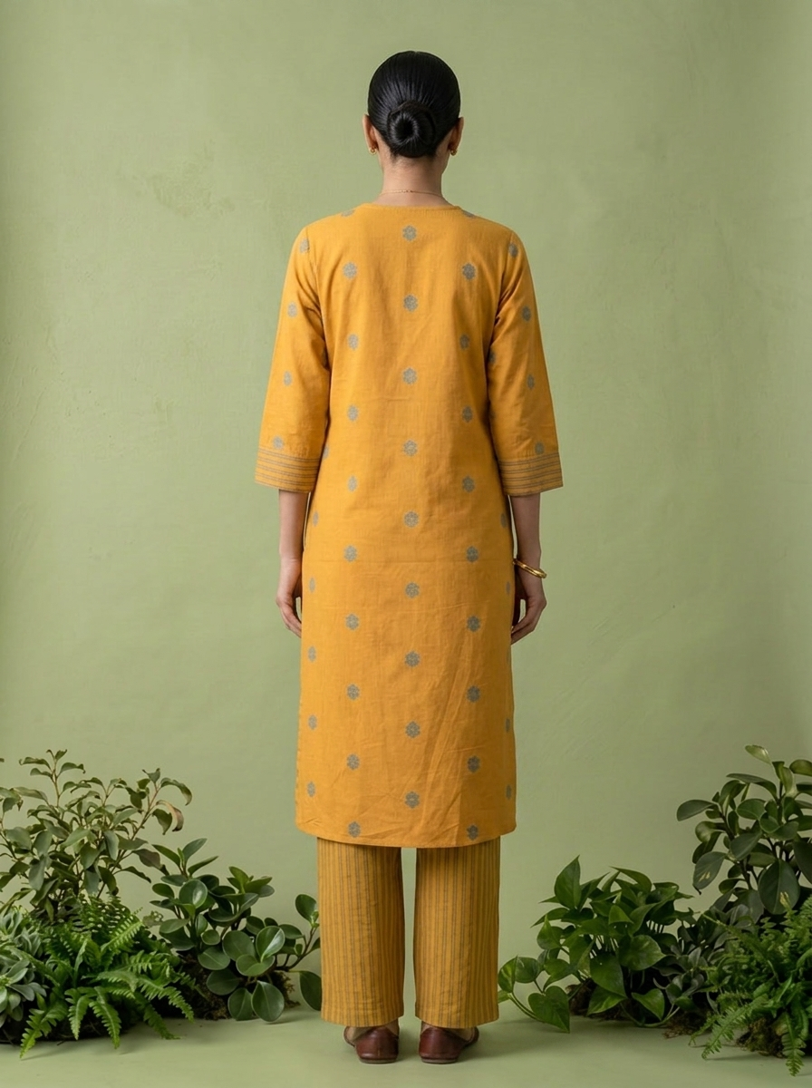 Elevate your ethnic wardrobe with this stunning mustard cotton two-piece set, adorned with delicate floral thread embroidery. The rich mustard hue complements the intricate embroidered detailing, creating a sophisticated and timeless look perfect for festive occasions, celebrations, or everyday elegance. Crafted from breathable cotton fabric, this set ensures comfort throughout the day while maintaining its structured silhouette. The floral embroidery adds an artistic touch, showcasing traditional craftsmanship with a contemporary appeal.