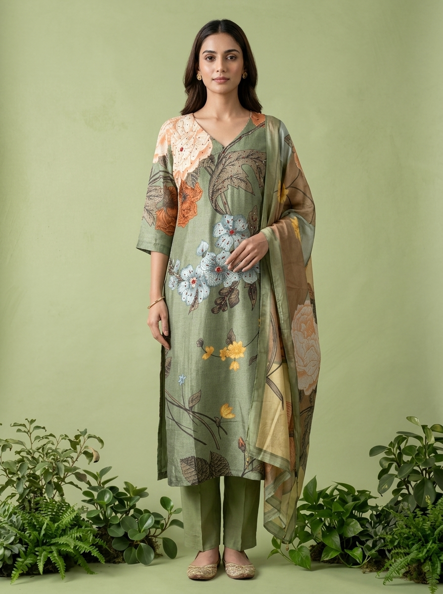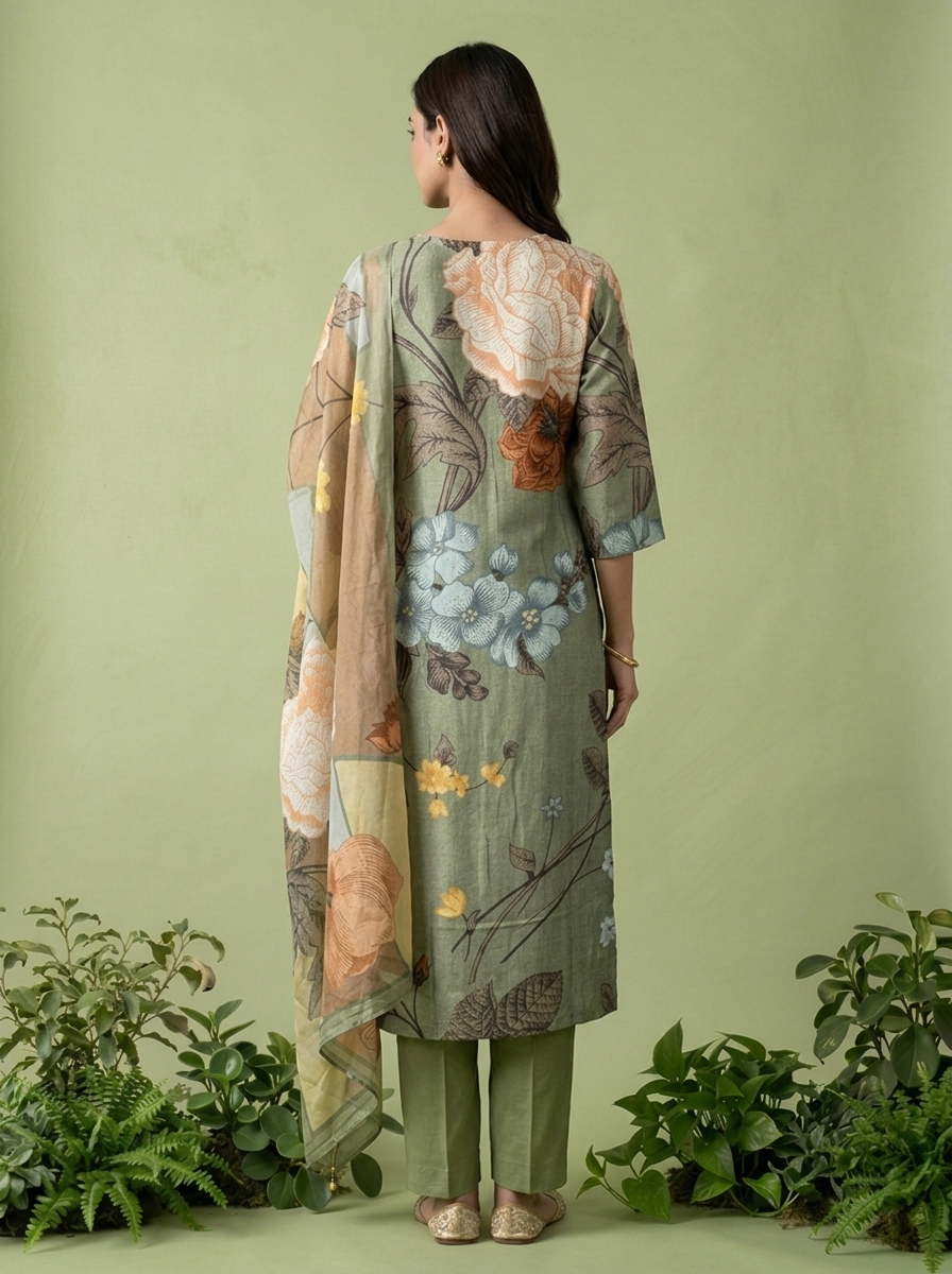 Embrace timeless elegance with this exquisite three-piece set crafted from soft, breathable muslin fabric. The olive base is adorned with delicate floral digital prints that bring nature's beauty to your wardrobe. Perfect for casual gatherings, festive occasions, or everyday wear, this versatile ensemble combines comfort with sophisticated style. The coordinated pieces work seamlessly together, offering effortless styling for the modern woman. Ideal for the Indian climate, muslin's lightweight texture ensures all-day comfort without compromising on grace. A wardrobe essential that transitions beautifully from day to evening.