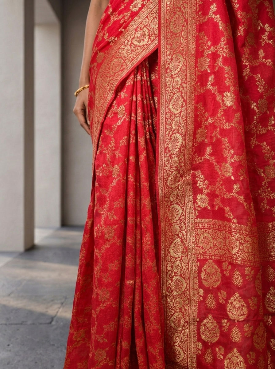 Embrace timeless elegance with this stunning Rani Pink Banaras saree, a masterpiece of traditional Indian craftsmanship. Adorned with intricate floral designs meticulously woven into the fabric, this saree showcases the rich heritage of Banaras weaving. The luxurious rani pink hue exudes sophistication and grace, making it perfect for weddings, festivals, and special occasions. Crafted with premium quality materials, the saree drapes beautifully and offers exceptional comfort throughout the day.