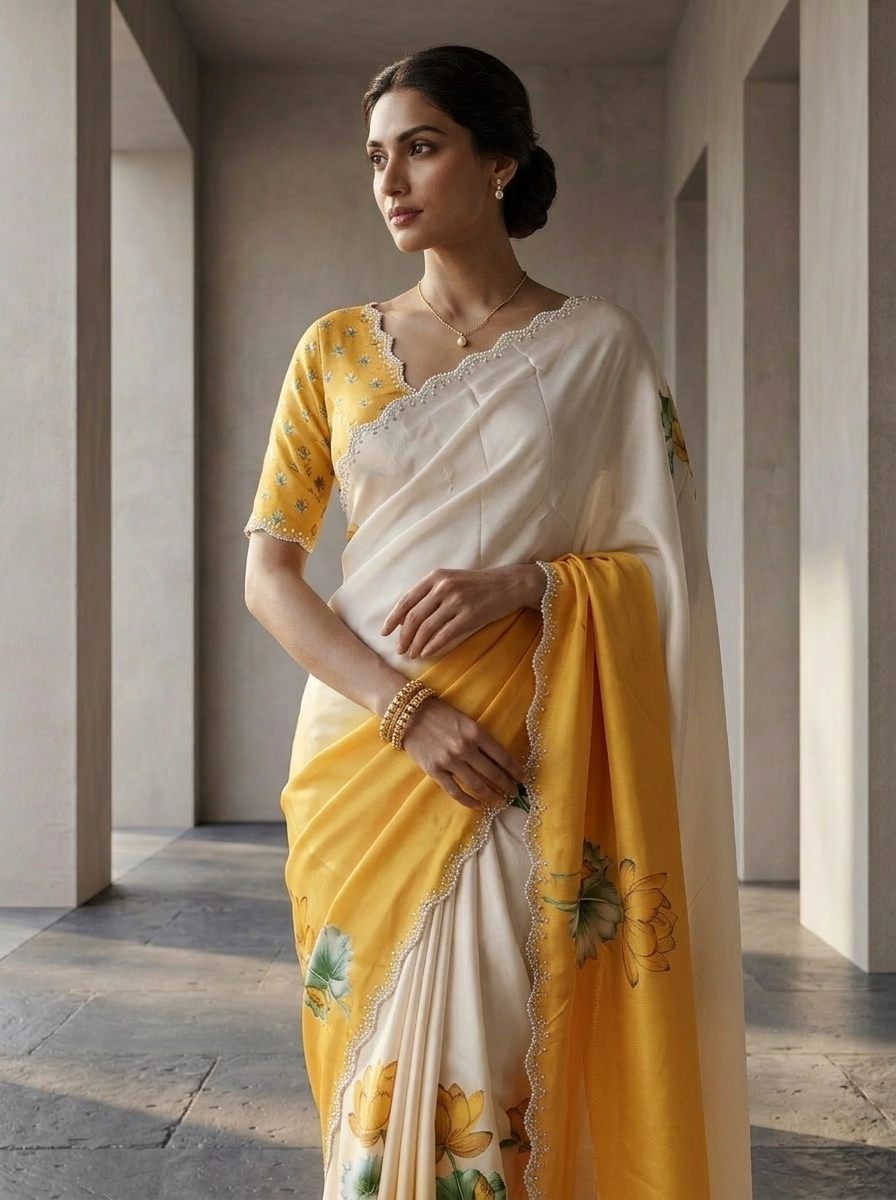 Elevate your ethnic wardrobe with this stunning white and mustard satin printed saree. The luxurious satin fabric drapes beautifully, offering a sophisticated sheen that catches light gracefully. The vibrant mustard print against the crisp white base creates a striking contrast, perfect for festive occasions, celebrations, or elevated everyday wear. The smooth satin texture ensures comfort while maintaining an elegant silhouette. This versatile piece pairs effortlessly with traditional jewelry and can be styled in multiple ways to suit your personal aesthetic. Ideal for weddings, parties, and special gatherings, this saree brings together timeless tradition with contemporary design.