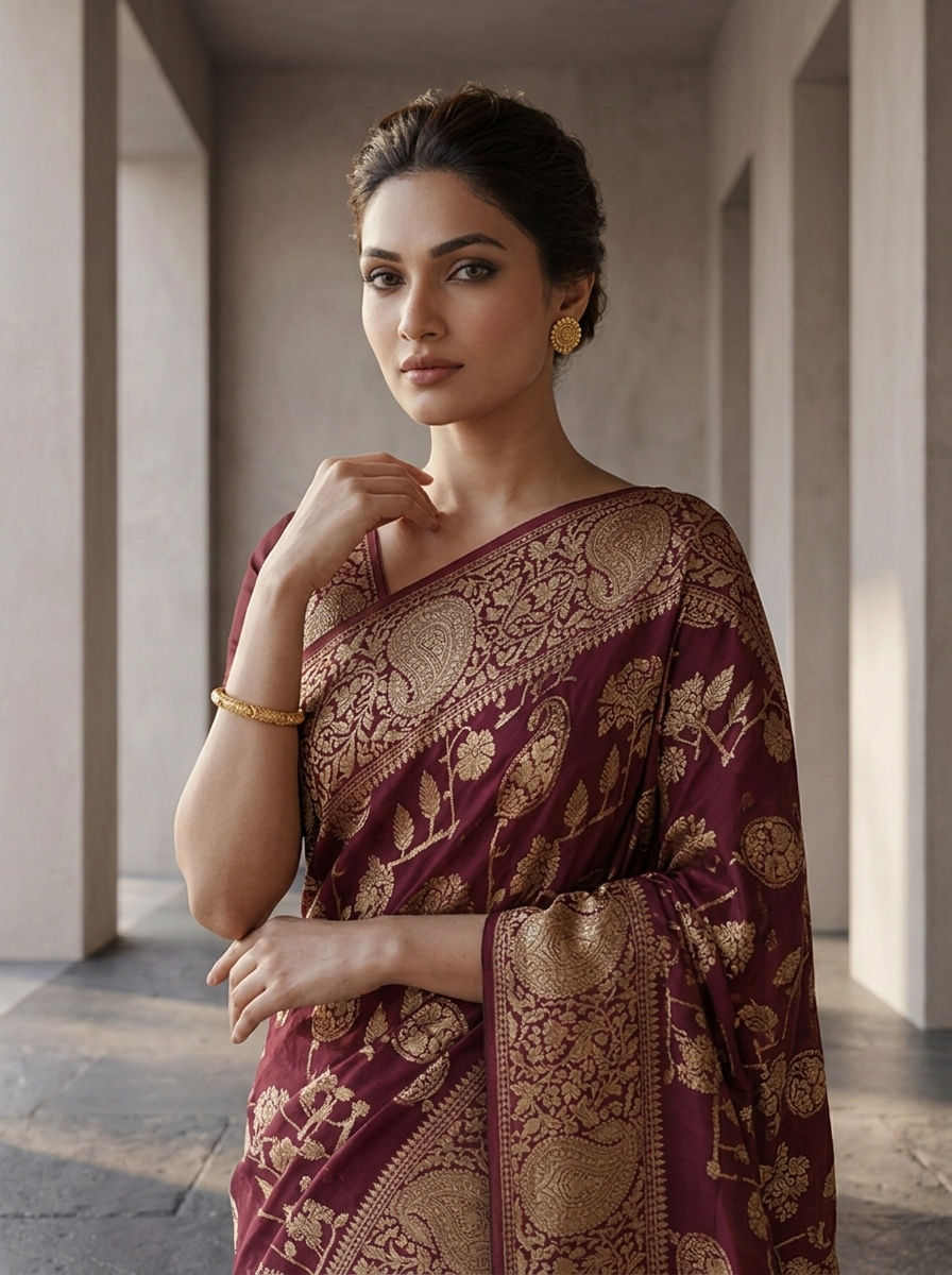 Elevate your ethnic wardrobe with this stunning Wine Banaras Paisley Design Weaved Saree. Crafted with traditional weaving techniques, this saree features an intricate paisley pattern that showcases timeless elegance and sophistication. The rich wine hue complements all skin tones, making it perfect for weddings, festivals, and special occasions. The saree drapes beautifully with its classic Banaras weave, known for its durability and lustrous finish. The detailed paisley motifs add depth and character to every wear. Pair it with traditional jewelry and a contrasting blouse to complete your look.