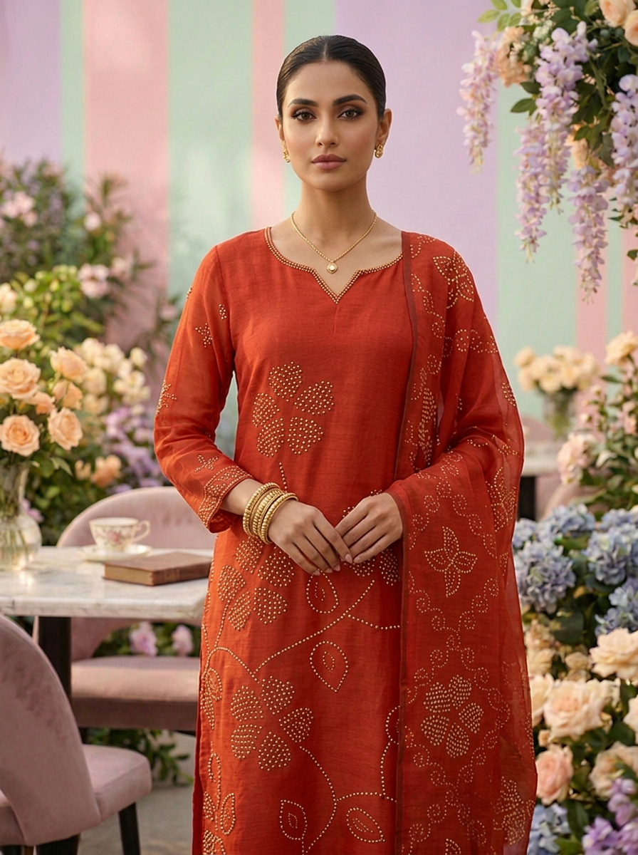 Elevate your ethnic wardrobe with this stunning three-piece set in burnt orange linen. Featuring an intricate floral print, this ensemble combines traditional elegance with contemporary comfort. The breathable linen fabric ensures all-day wearability, making it perfect for festive occasions, family gatherings, or casual outings. The harmonious color palette and detailed craftsmanship reflect timeless Indian design sensibilities. Versatile and sophisticated, this set is an essential addition to your collection.