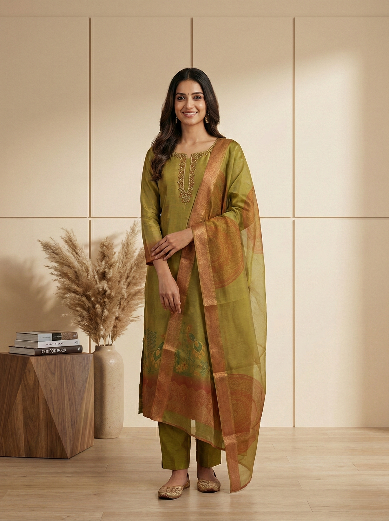 Elevate your ethnic wardrobe with this sophisticated three-piece ensemble featuring intricate zari embroidery on a rich green stone base. The set combines traditional craftsmanship with refined aesthetics, showcasing detailed metallic threadwork that catches light beautifully. Perfect for festive occasions, weddings, and celebrations, this versatile collection offers the elegance of heritage textiles with contemporary styling. Each piece is meticulously crafted to deliver both comfort and timeless appeal, making it an essential addition to your traditional wear collection.