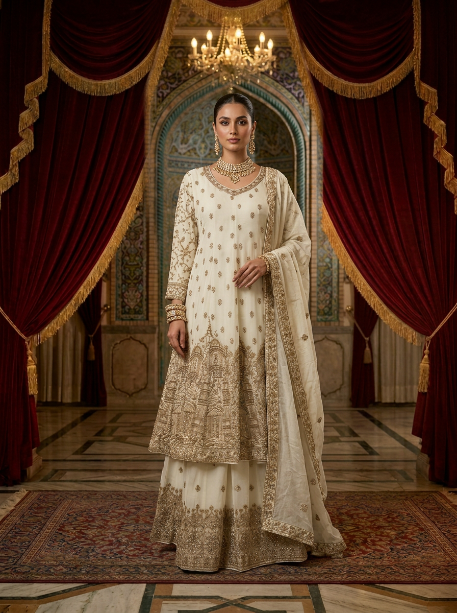 Elevate your ethnic wardrobe with this stunning cream georgette sharara set, featuring intricate embroidery work that captures traditional craftsmanship. The gracefully draped sharara paired with a coordinated kurta creates an elegant silhouette perfect for weddings, festivals, and special occasions. The included dupatta adds versatility and sophistication to your ensemble. Crafted from lightweight georgette fabric, this set ensures comfort throughout the day while maintaining its refined appearance. An ideal choice for those seeking timeless ethnic elegance with contemporary styling.