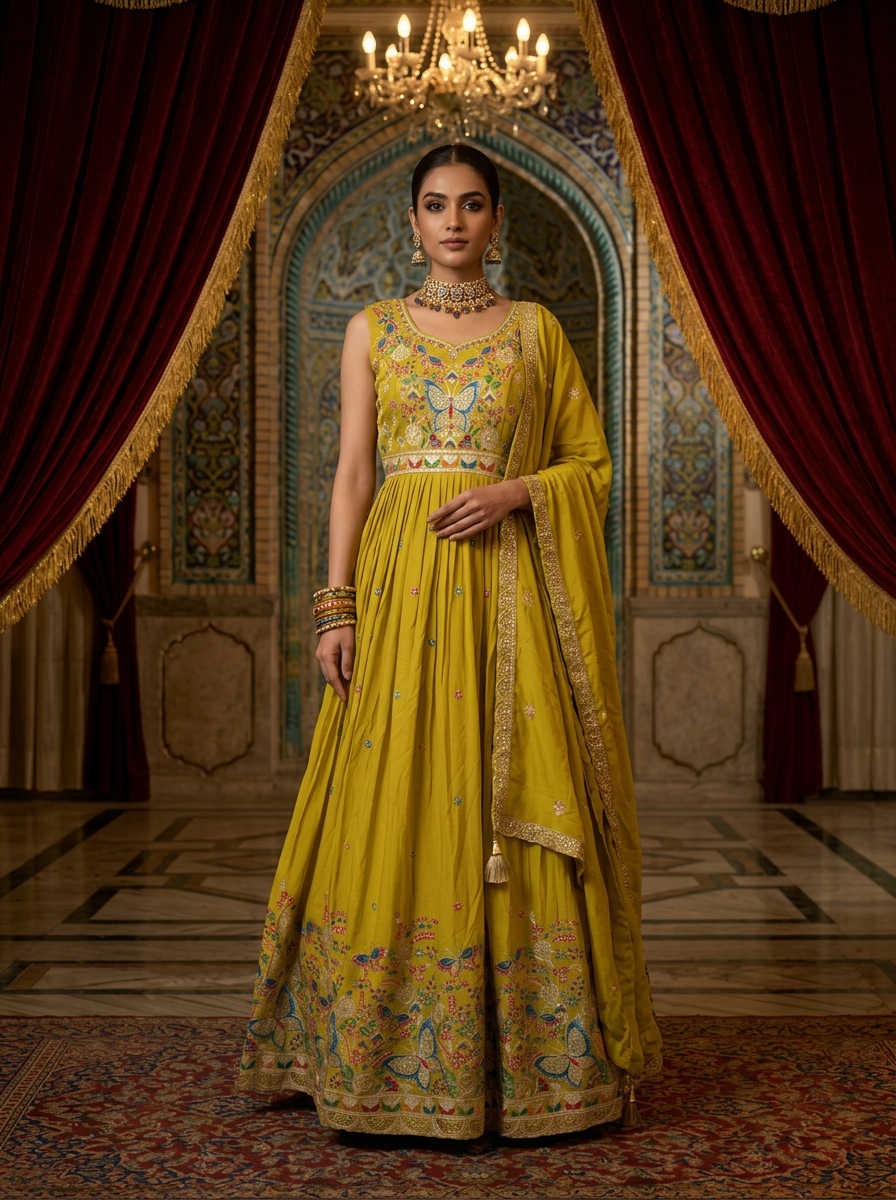 Elevate your ethnic wardrobe with this stunning Variyali green Anarkali set, crafted from premium chinon fabric. The ensemble features intricate floral thread embroidery that adds timeless elegance to the silhouette. The set includes a beautifully coordinated dupatta, perfect for completing your traditional look. Ideal for weddings, festivals, and special occasions, this piece combines comfort with sophisticated craftsmanship. The flowing Anarkali cut flatters all body types while the delicate embroidery work showcases fine artisanal detail. A versatile choice for those who appreciate quality ethnic fashion.