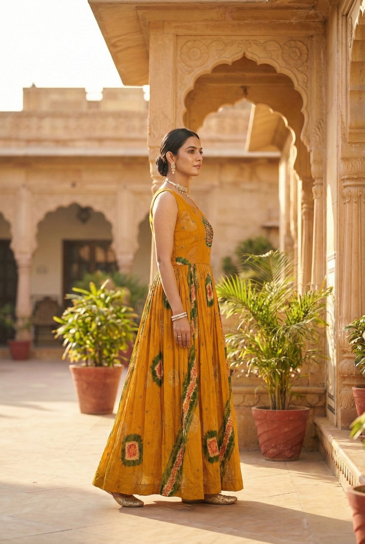 Elevate your ethnic wardrobe with this exquisite Gold Chinon dress, adorned with intricate beads and stone embroidery. Crafted from premium chinon fabric, this piece seamlessly blends traditional artistry with contemporary elegance. The lustrous gold embellishments create a radiant, eye-catching appeal perfect for weddings, celebrations, and special occasions. The lightweight, breathable fabric ensures comfort throughout the day, while the detailed embroidery work showcases masterful craftsmanship. An ideal choice for those seeking refined sophistication and timeless style.