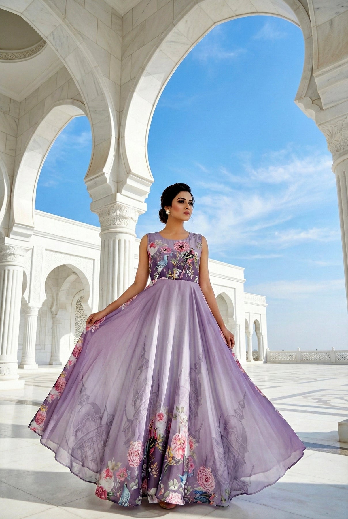 Elevate your ethnic wardrobe with this stunning lavender crepe long dress, where traditional craftsmanship meets contemporary elegance. Each piece features intricate hand embroidery with delicate floral motifs that showcase the artistry of skilled artisans. The soft, breathable crepe fabric drapes beautifully, ensuring comfort throughout the day while maintaining a graceful silhouette. Perfect for festive occasions, celebrations, or making a refined statement at any gathering, this dress combines timeless design with premium quality. Embrace the perfect blend of heritage and style that only authentic hand-embroidered pieces can offer.