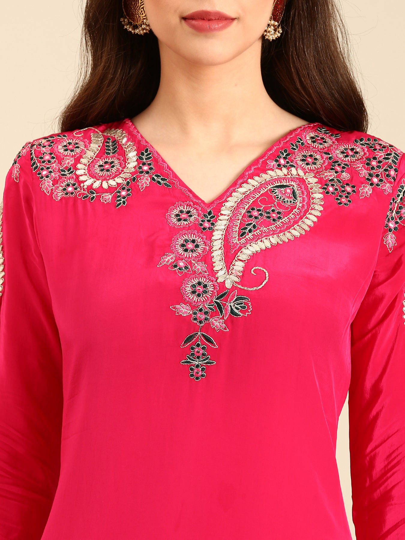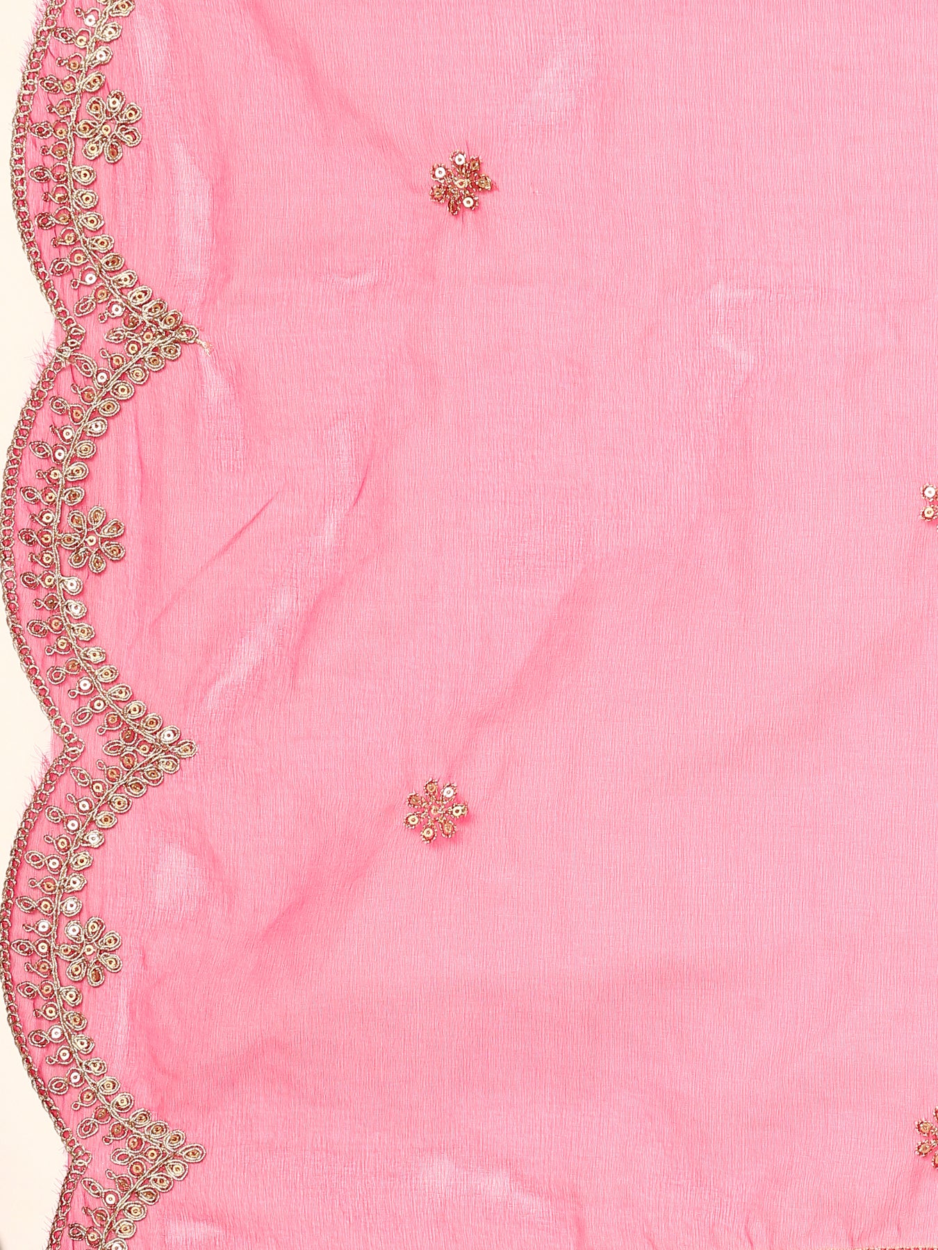 This pink crepe suit features a flattering V-neck and delicate shoulder zari embroidery, enhanced with intricate gotta patti work. The combination of elegant detailing and soft crepe fabric offers both style and comfort, making it perfect for special occasions when you want to look your best with ease.