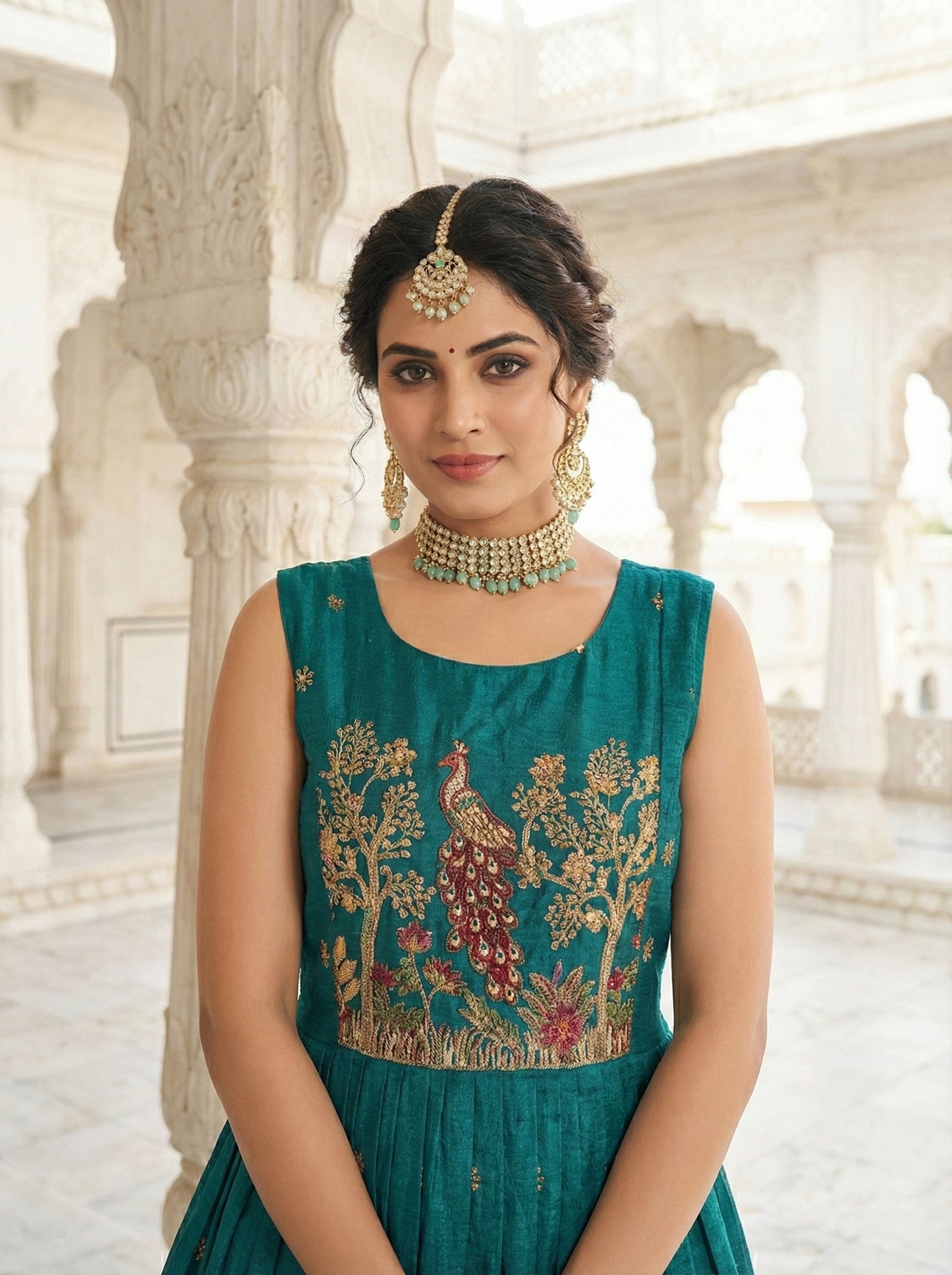 Rama Chinon Peacock Motif Block Print Long Dress Embrace timeless elegance with this exquisite chinon dress, featuring an enchanting peacock motif rendered through traditional block print techniques. The flowing silhouette drapes beautifully, offering both comfort and sophistication for any occasion. Crafted with meticulous attention to detail, each peacock design tells a story of artisanal craftsmanship. The lightweight chinon fabric ensures breathability while maintaining its graceful movement, making it perfect for celebrations, gatherings, or everyday wear. A stunning fusion of heritage artistry and contemporary style that elevates your wardrobe with authentic Indian craftsmanship.