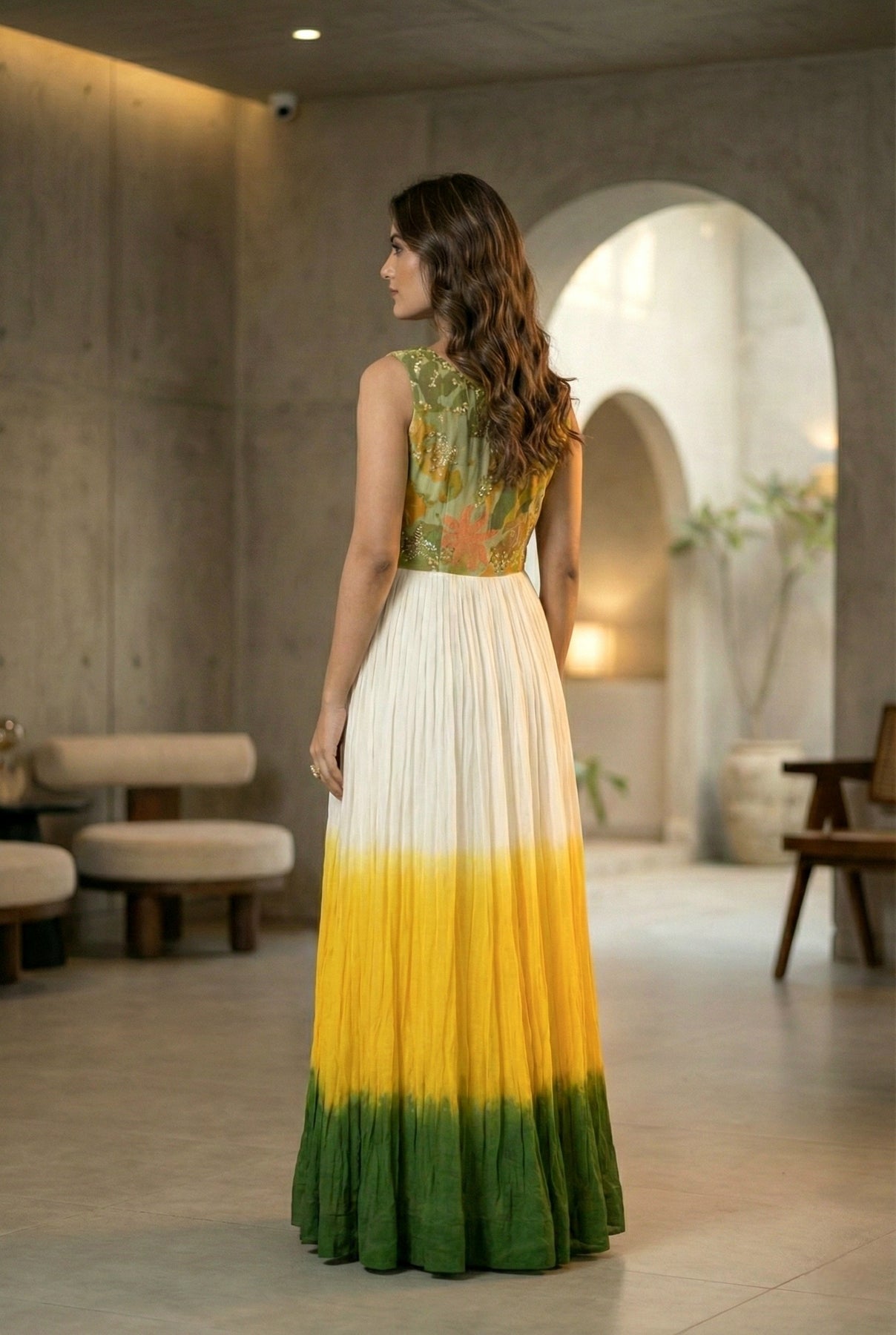 Elevate your ethnic wardrobe with this stunning yellow chinon long dress, featuring intricate floral digital prints that blend traditional elegance with contemporary design. Crafted from premium chinon fabric, known for its lightweight drape and breathable comfort, this piece is ideal for festive occasions, celebrations, or refined everyday wear. The vibrant yellow hue complements diverse skin tones, while the detailed floral motifs add visual depth and sophistication. Perfect for those seeking versatile, graceful silhouettes that transition seamlessly from day to evening events.