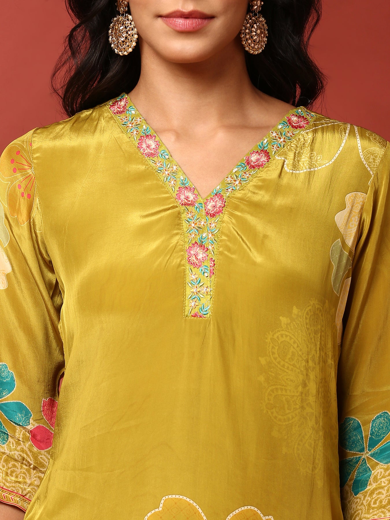 Elevate your ethnic wardrobe with this Mehendi green crepe three-piece suit set. Featuring a rich, calming green shade and silky crepe fabric, it offers both comfort and style. The set includes a beautifully tailored kurta, matching bottoms, and a coordinating dupatta, providing a complete look for festive occasions or casual gatherings.