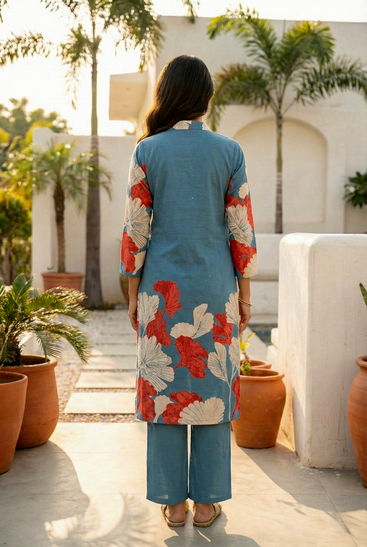 Elevate your everyday wardrobe with this stunning teal cotton two-piece set, featuring vibrant digital prints that capture attention and express your unique style. Crafted from breathable, premium cotton fabric, this versatile ensemble offers exceptional comfort for all-day wear. The coordinated pieces work beautifully together or separately, giving you endless styling possibilities for casual outings, weekend gatherings, or relaxed office settings. Perfect for those who appreciate quality craftsmanship and contemporary design, this set combines practicality with modern aesthetics. Embrace effortless elegance and make a confident statement with this must-have addition to your collection.