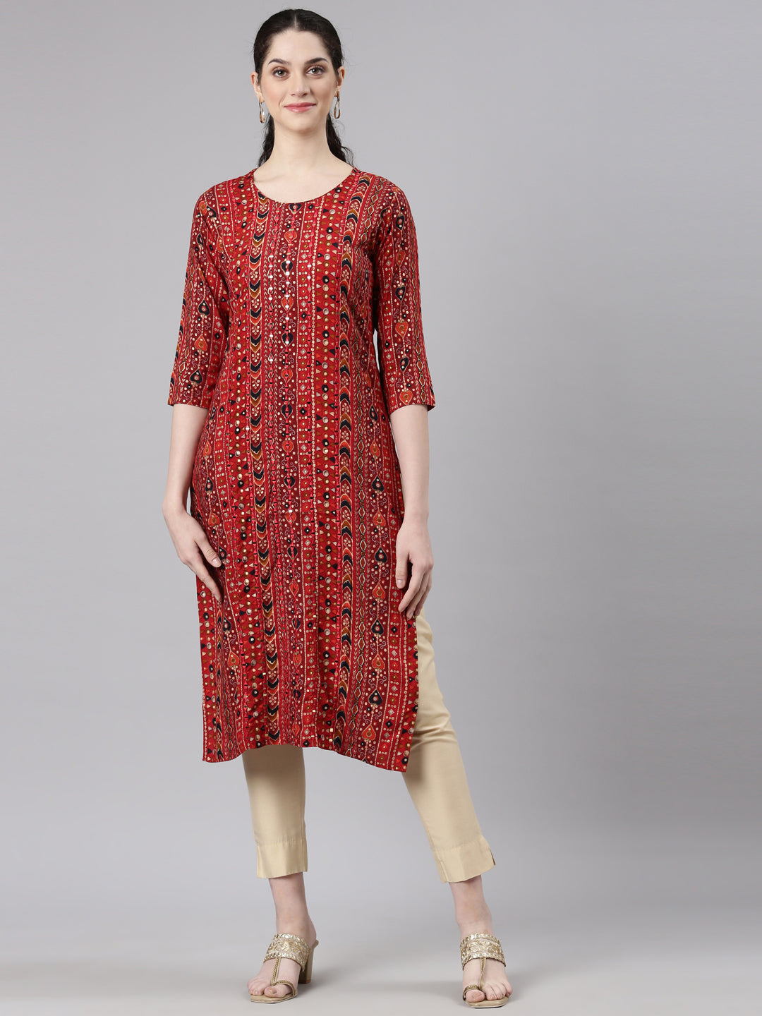 Neerus Red Straight Casual Embellished Kurtas Elevate your style with Neerus Red Straight Casual Embellished Kurtas. Stand out in comfort and sophistication with this beautifully designed piece.
