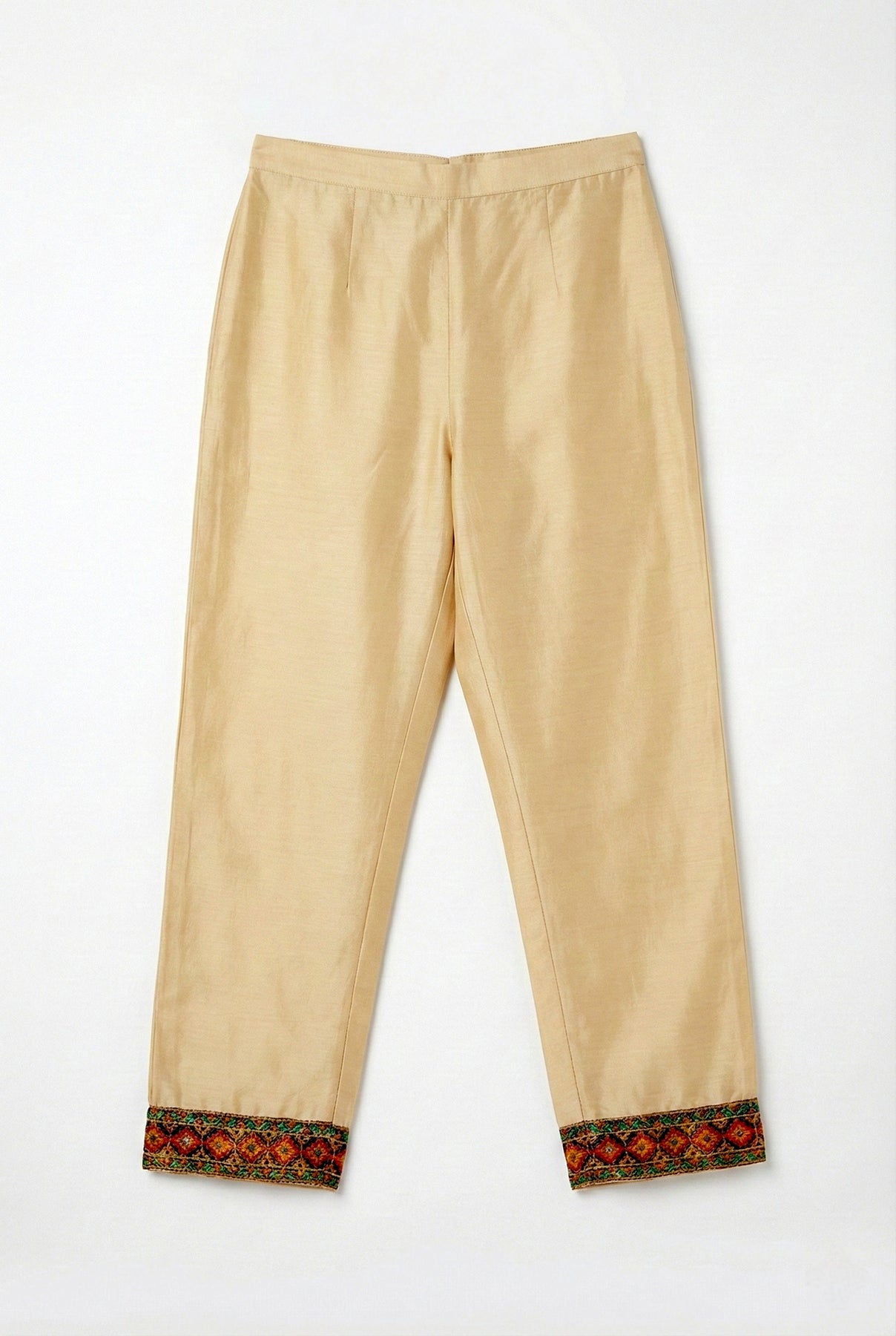 Elevate your ethnic wardrobe with this sophisticated beige silk suit set, where traditional craftsmanship meets contemporary design. The ensemble features intricate zari embroidery that adds timeless elegance, complemented by vibrant digital prints that bring modern flair. Crafted from premium silk, this piece offers a luxurious drape and comfortable wear for festive occasions, celebrations, or refined everyday styling. The harmonious blend of hand-embroidered details and precision-printed patterns creates a versatile look that transitions seamlessly from day to evening wear. Perfect for those who appreciate quality fabrics and detailed artisanal work.