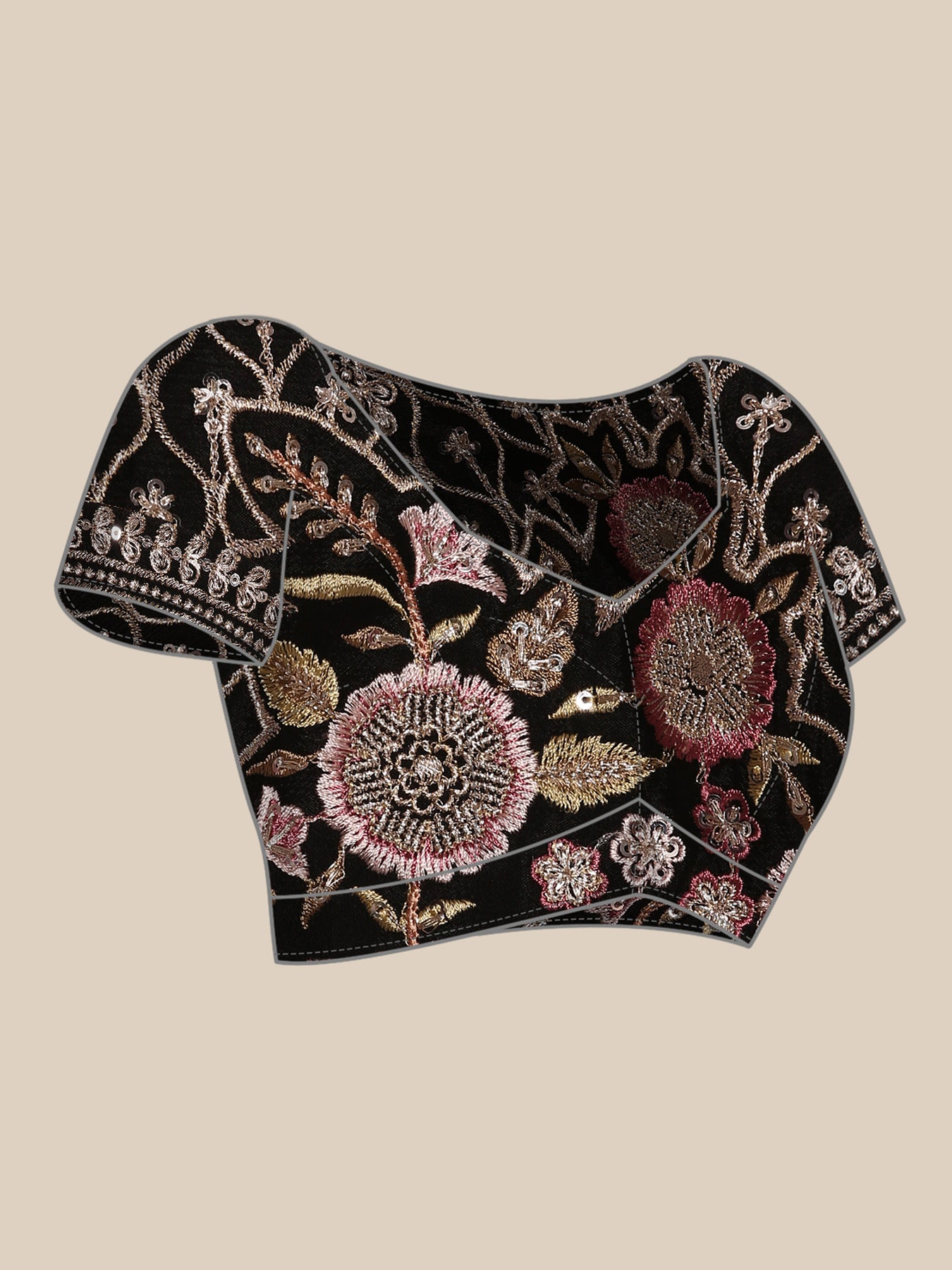 The saree is accompanied by a stylish, ready-made blouse designed to complete your look.