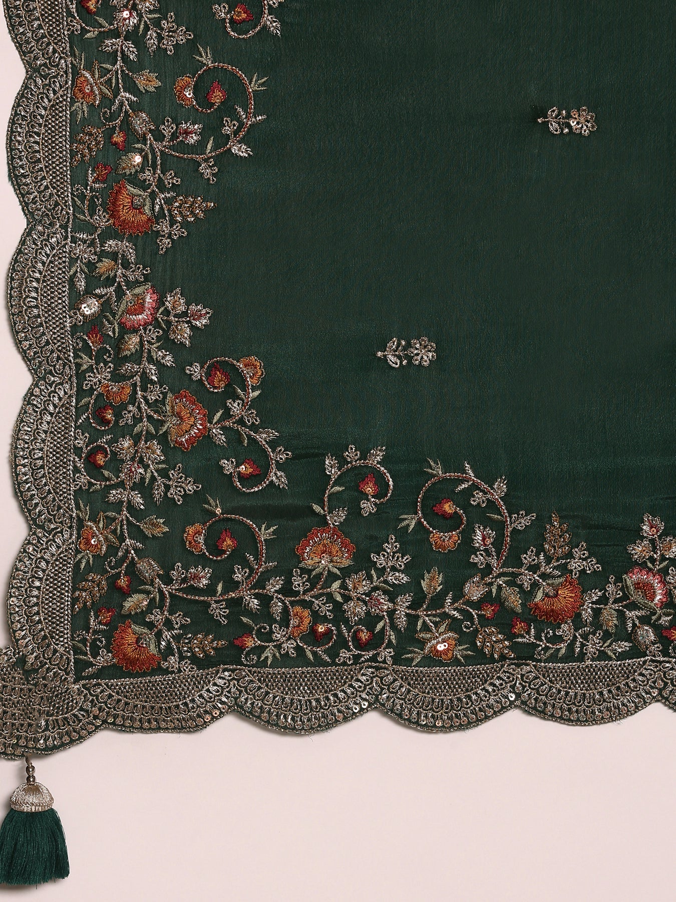 Bottle Green Crepe Embroidery Saree With Readymade Blouse