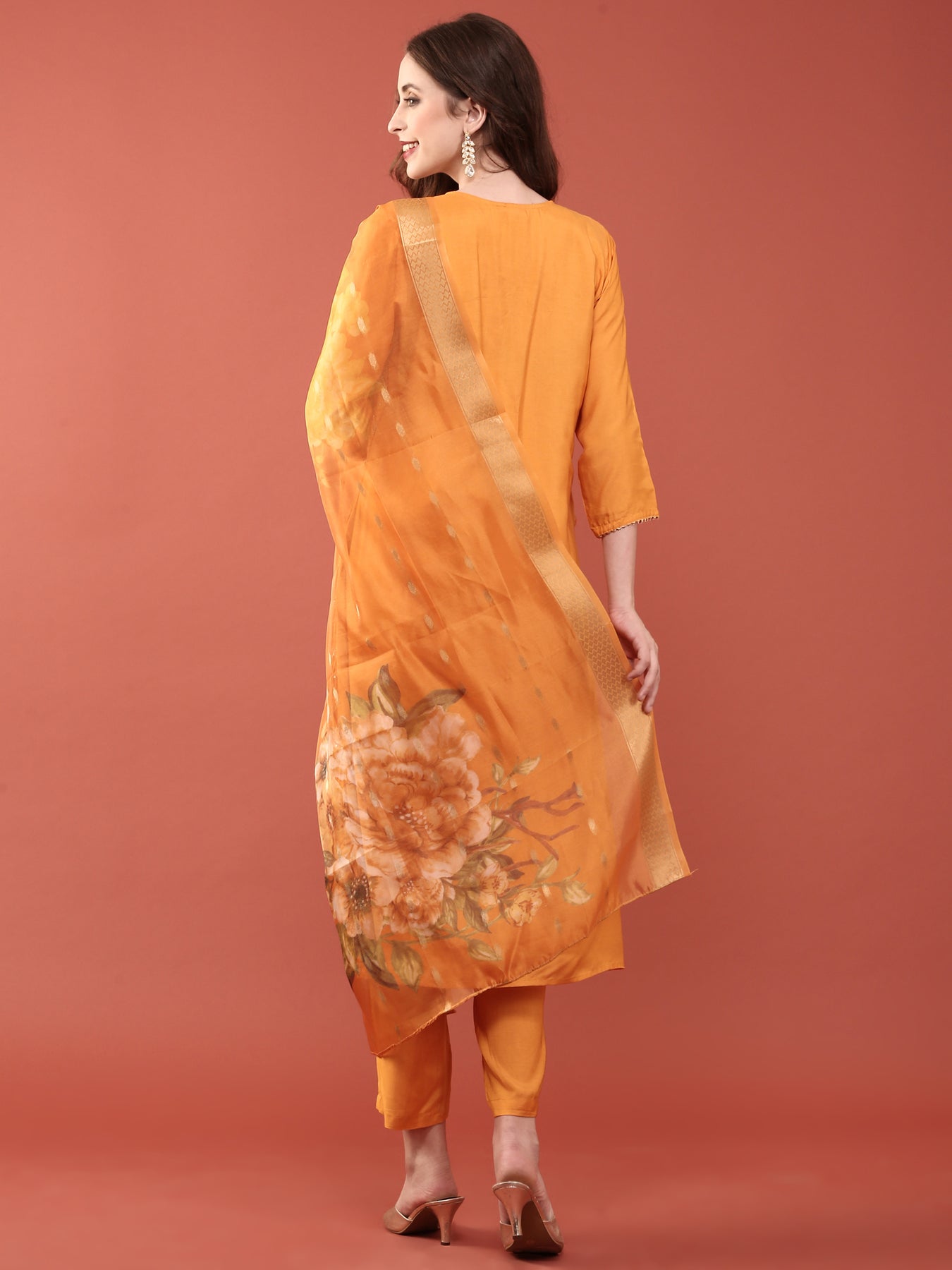 Elevate your wardrobe with this striking three-piece muslin ensemble in vibrant bright orange. Crafted from premium muslin fabric, this set offers exceptional breathability and comfort, making it ideal for warm weather wear. The coordinated pieces provide versatile styling options for both casual and semi-formal occasions.