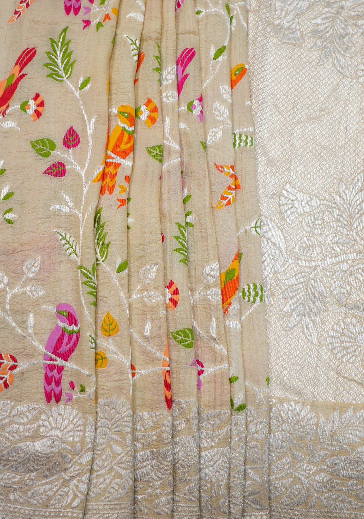 Cream Pure Handloom Tussar Saree With All Over MultiColour Birds