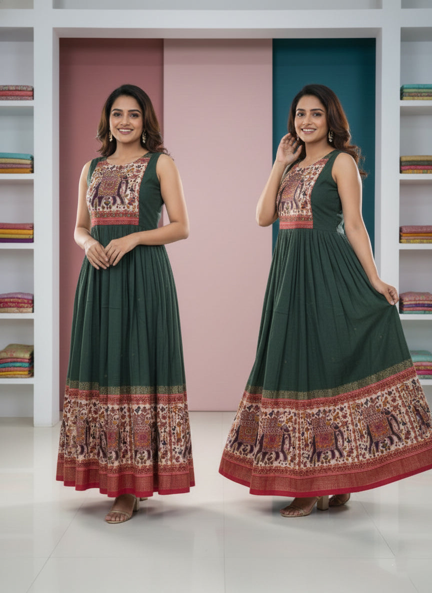 Embrace effortless elegance with this stunning green long dress, crafted from premium dola poly fabric that drapes beautifully. The vibrant digital print adds contemporary flair to a timeless silhouette, making it perfect for festive occasions, celebrations, or everyday sophistication. The flowing design ensures comfort and grace, while the rich green hue complements all skin tones. Whether you're attending a wedding, party, or special gathering, this dress combines traditional charm with modern style. A versatile wardrobe essential that lets you feel confident and radiant.