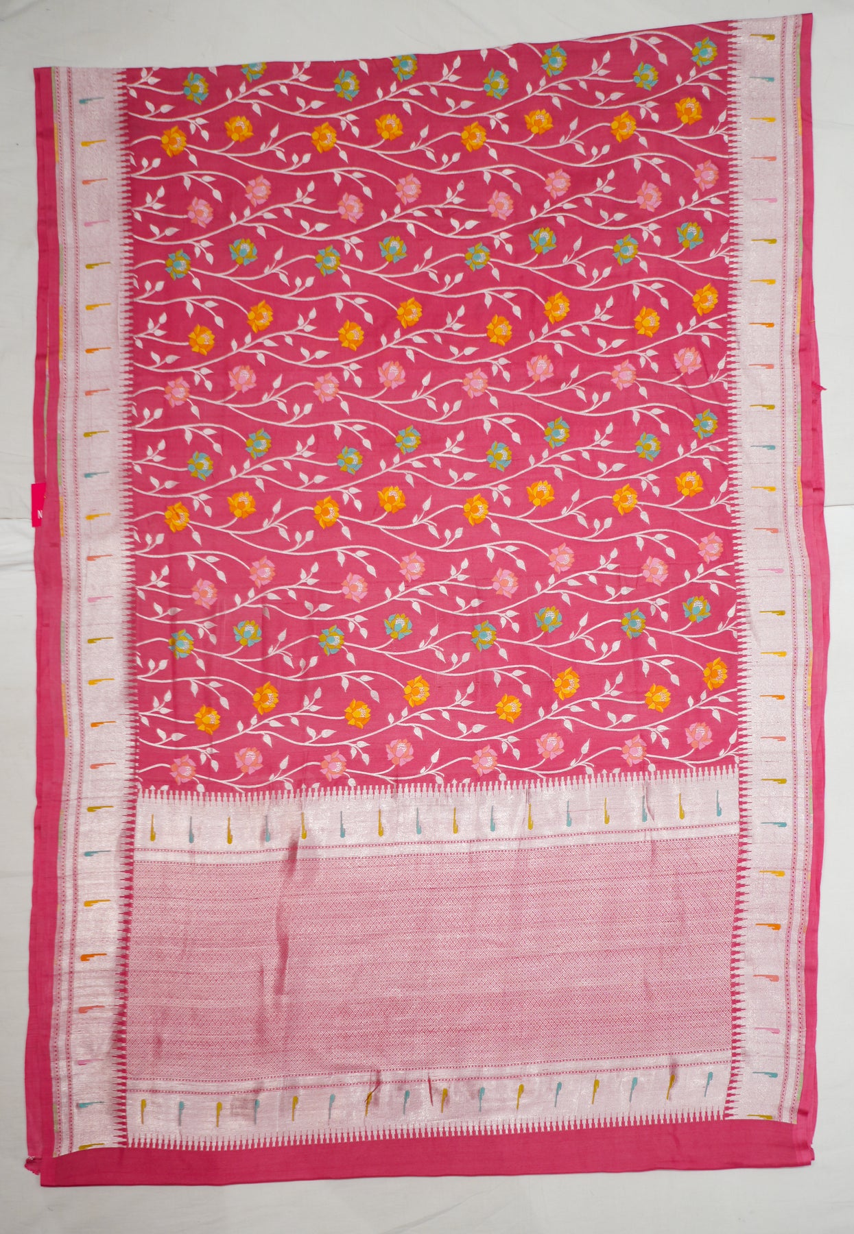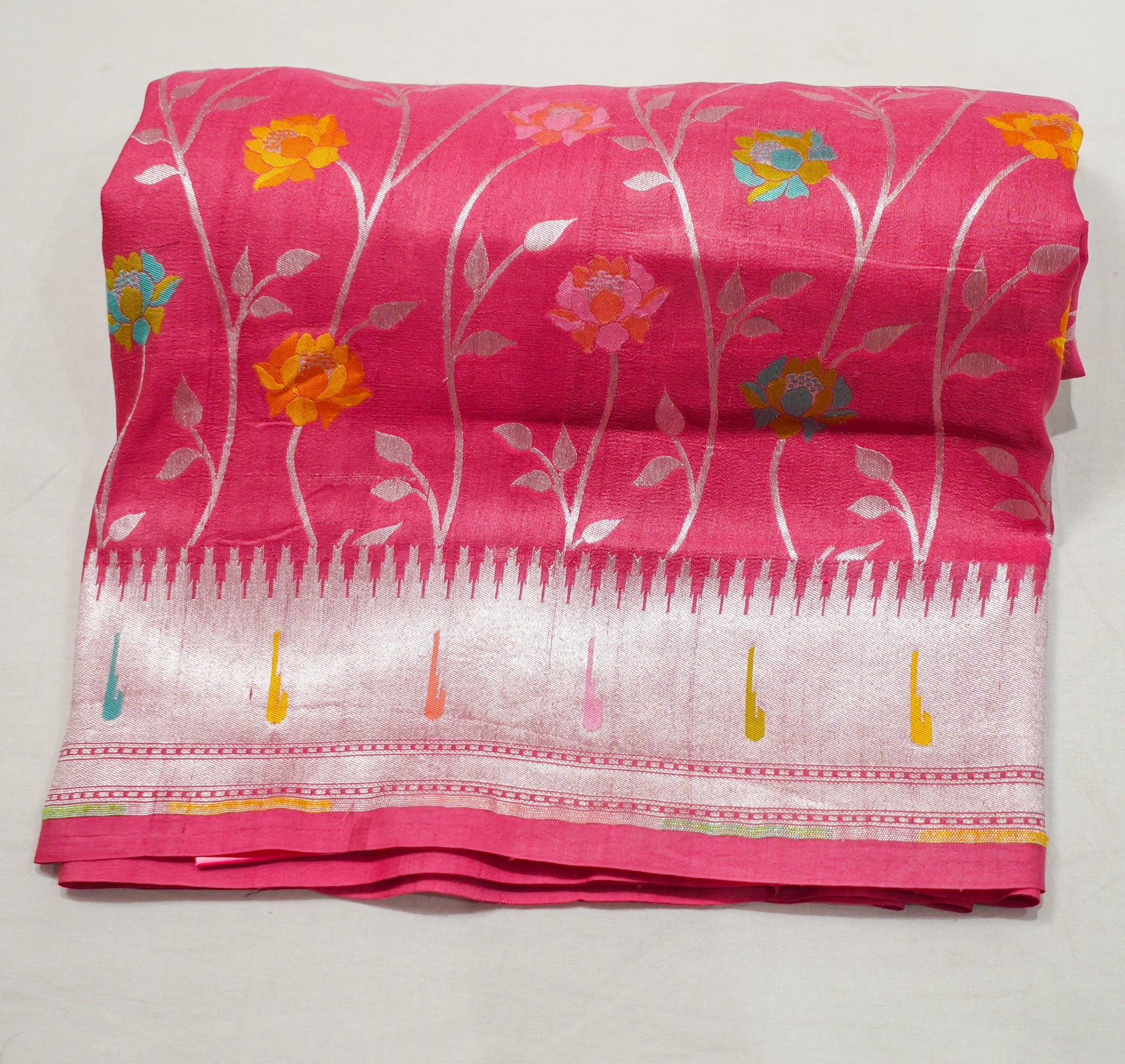 Peach Pure Handloom Tussar With Paithani Muniya Border All Over Multicolour Flowers