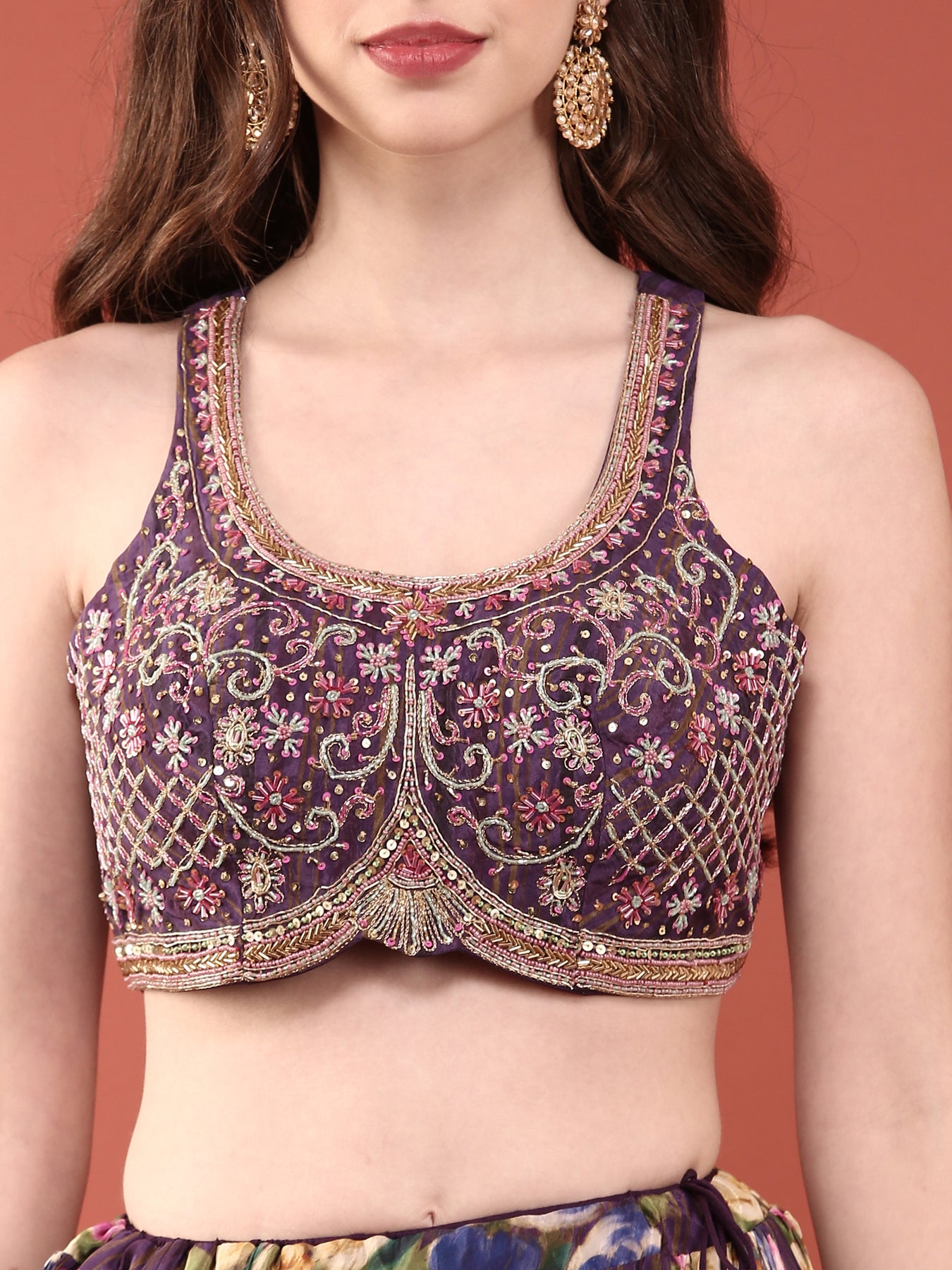 Elevate your ethnic wardrobe with this exquisite purple crepe ghagra set, meticulously crafted with intricate hand embroidery. The flowing silhouette and rich hue create an understated elegance, while the detailed embroidered work showcases traditional artistry. Perfect for weddings, celebrations, and special occasions, this ensemble combines timeless grace with contemporary styling. The breathable crepe fabric ensures comfort throughout your event, making it an ideal choice for the discerning woman who appreciates refined craftsmanship and cultural heritage.