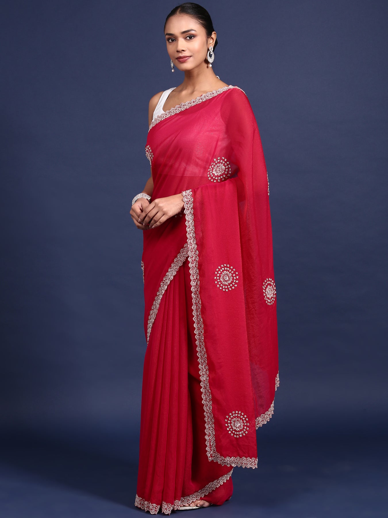 Elevate your ethnic wardrobe with this stunning Rani Pink Satin Aari Embroidery Saree. Crafted from luxurious satin fabric, this saree features intricate aari embroidery work that adds timeless elegance to your look. The rich rani pink hue complements all skin tones beautifully, making it perfect for weddings, festivals, and special occasions. The smooth satin drape ensures comfort while maintaining a graceful silhouette. Pair it with traditional jewelry and a complementary blouse to complete your sophisticated ensemble. A versatile piece that celebrates traditional craftsmanship with contemporary style.