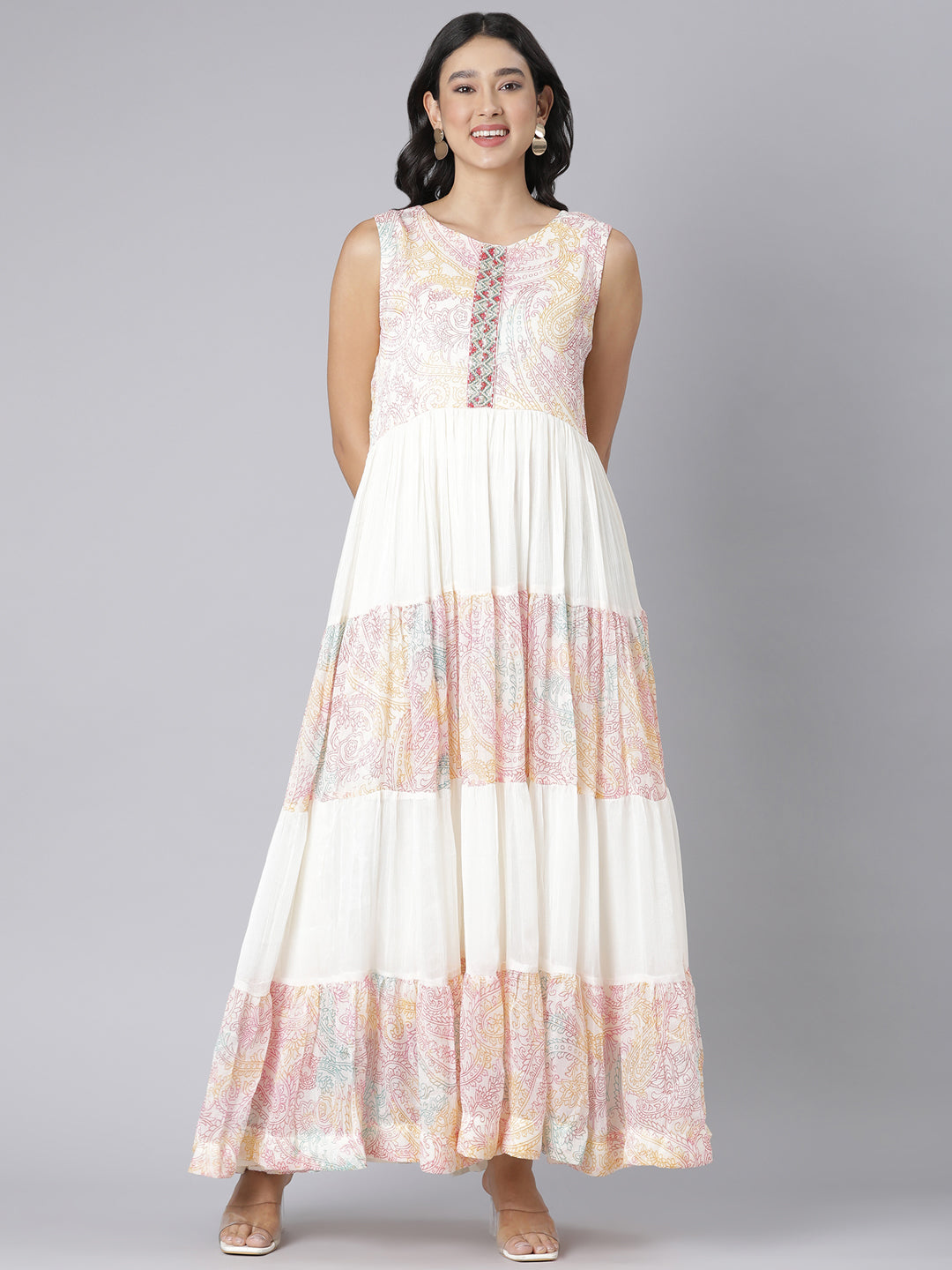 Neerus Cream Casual Paisley Maxi Dresses feature a delicate paisley print on a soft cream fabric, designed to offer both comfort and style. The maxi length provides a graceful drape, perfect for casual occasions or relaxed outings.