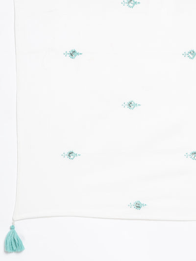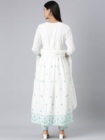 Elevate your ethnic wardrobe with this sophisticated three-piece ensemble featuring a green embroidered kurta with elegant curved hemline, complemented by matching trousers and dupatta.