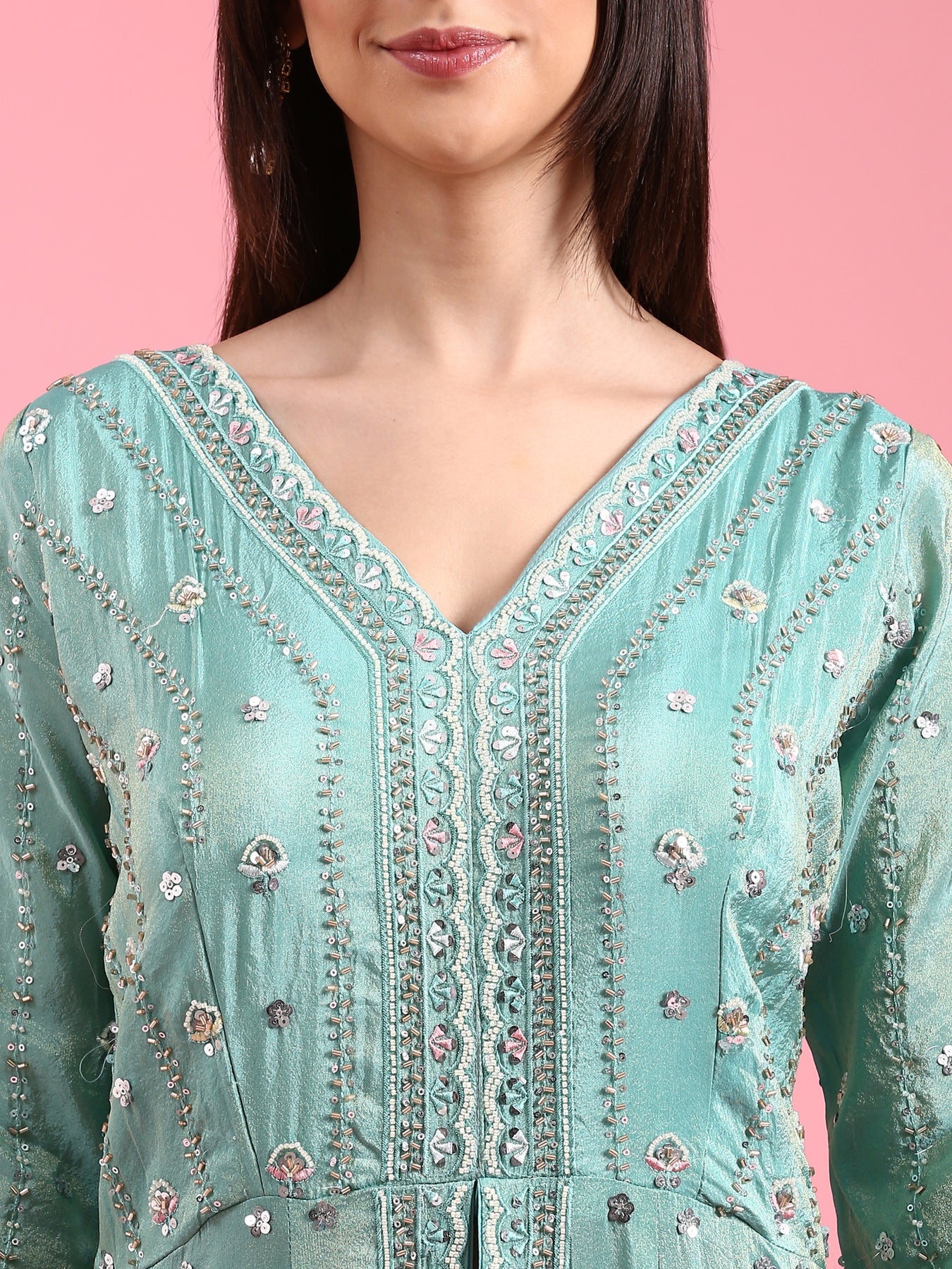 Elevate your wardrobe with this elegant Sea Green Tissue beads work kali paired with a matching palazzo. The delicate beadwork adds a refined texture, while the flowing palazzo ensures comfort and grace. Perfect for sophisticated occasions, this ensemble blends traditional craftsmanship with contemporary style for a poised and polished look.