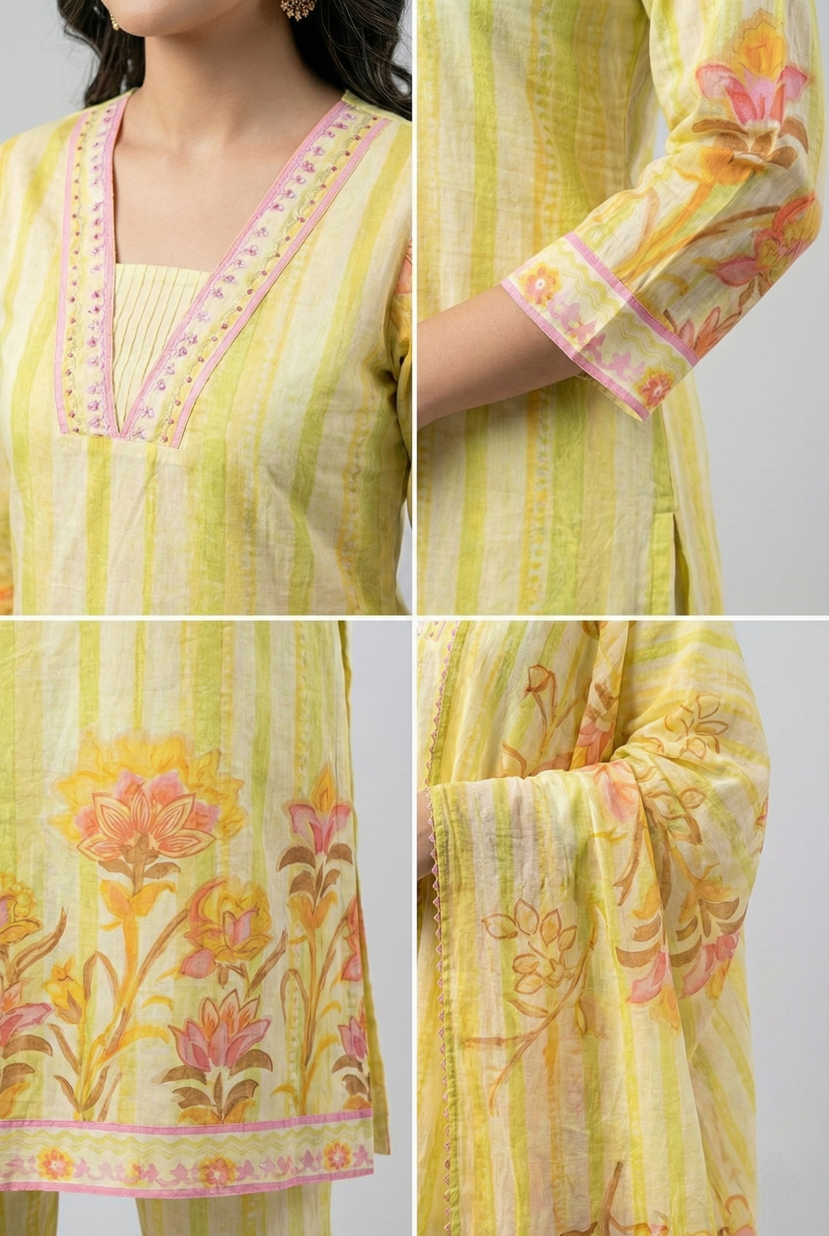 Elevate your ethnic wardrobe with this stunning lime cotton three-piece set, meticulously crafted with intricate hand embroidery. Each piece showcases traditional artisanal detailing that brings timeless elegance to your everyday style. The vibrant lime hue offers a fresh, contemporary twist on classic designs, making it perfect for festive occasions, celebrations, or refined casual wear. Crafted from breathable cotton, this set ensures comfort without compromising on sophistication. Discover the perfect blend of heritage craftsmanship and modern aesthetics that makes this collection a must-have addition to your traditional attire.