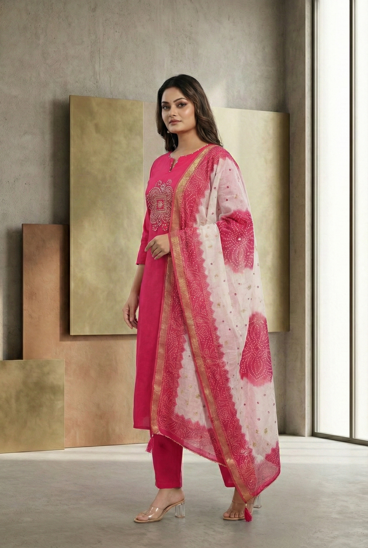 Elevate your ethnic wardrobe with this exquisite three-piece ensemble crafted from premium muslin fabric. Each piece features intricate aari embroidery in rich rani hues, showcasing traditional craftsmanship with contemporary elegance. The set includes a beautifully embroidered kurta, coordinating dupatta, and matching bottom, offering a complete, cohesive look perfect for festive occasions, celebrations, or refined everyday wear. The breathable muslin ensures comfort throughout the day while the detailed embroidery work adds timeless sophistication to your collection.