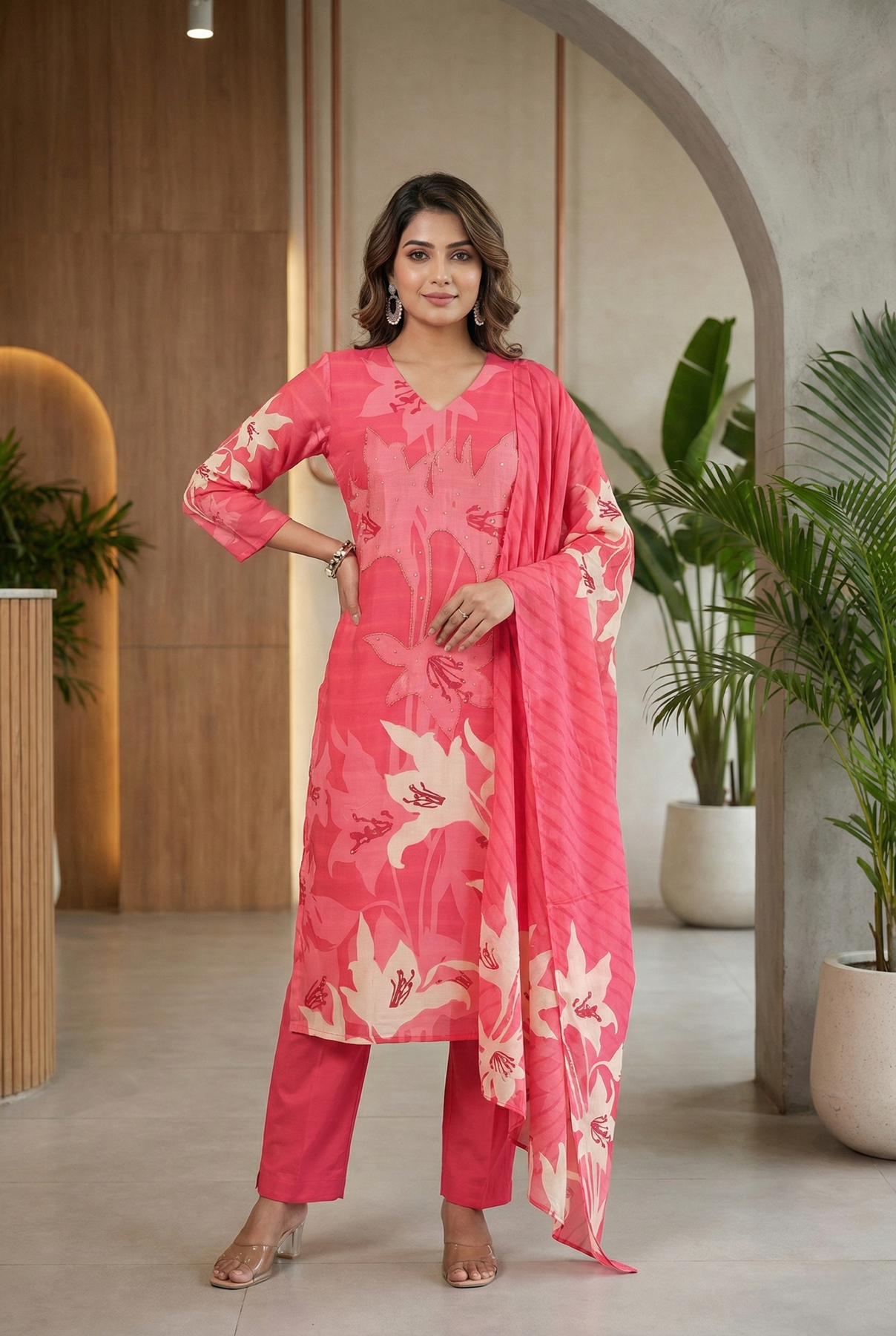 Elevate your ethnic wardrobe with this exquisite three-piece ensemble crafted from luxurious red silk. The collection features intricate floral prints paired with delicate beadwork embroidery, creating a harmonious blend of traditional artistry and contemporary elegance. Each piece is meticulously designed to complement the others, offering versatility for festive occasions, celebrations, or refined everyday wear. The rich crimson hue combined with ornate detailing ensures you make a graceful statement while maintaining timeless sophistication.