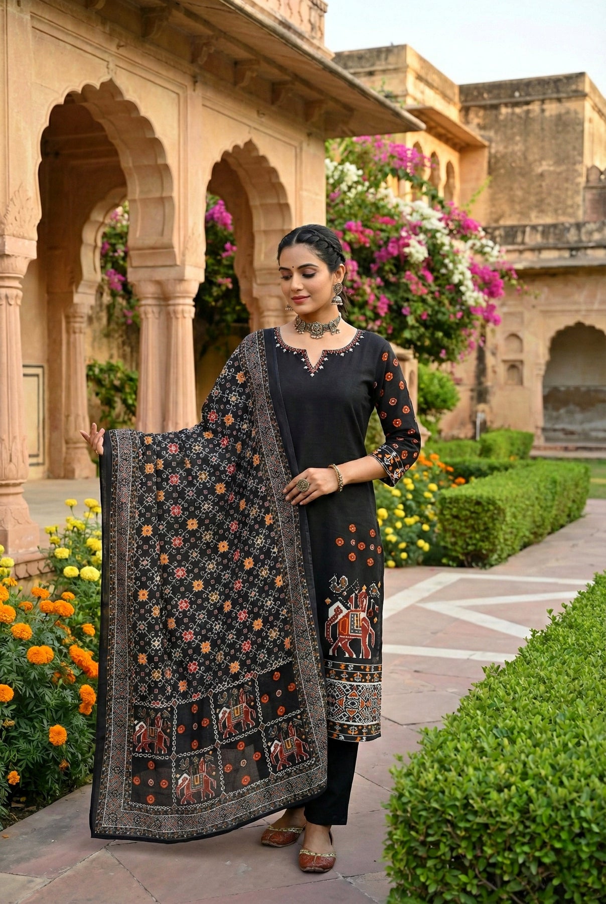 Elevate your ethnic wardrobe with this stunning three-piece ensemble crafted from luxurious black silk. Each piece features intricate hand embroidery work, showcasing traditional artistry and meticulous craftsmanship. The set offers versatile styling options for weddings, celebrations, and special occasions. The rich black fabric provides an elegant canvas for the detailed embroidered designs, creating a sophisticated look that's both timeless and contemporary. Perfect for those who appreciate quality textiles and appreciate the artistry of handmade details.