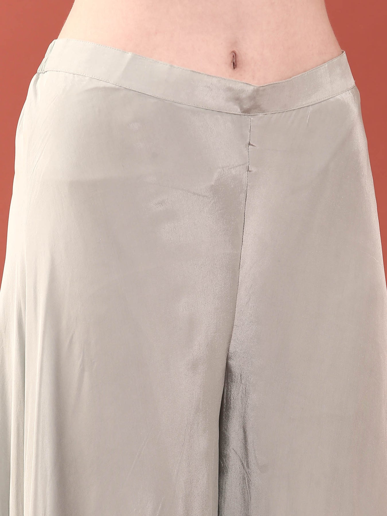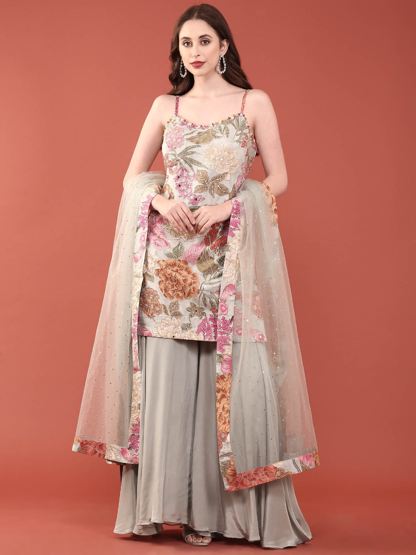 Elevate your ethnic wardrobe with this stunning grey crepe palazzo set, meticulously crafted with hand-embroidered beads and stones. The intricate embellishments create a sophisticated, eye-catching design perfect for festive occasions, weddings, or special celebrations. The flowing palazzo silhouette offers comfort without compromising on elegance, while the premium crepe fabric drapes beautifully.